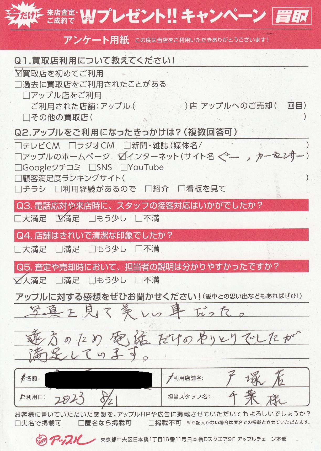 お車のご相談・ 査定だけでもOK! カンタン 入力 30秒 アップルがブランド買取始めました! お電話でも受付中! 受付時間10:00 ~ 19:00 045-828-2588 お車のご相談・ 査定だけでもOK! カンタン 入力 30秒 アップルがブランド買取始めました! お電話でも受付中! 受付時間10:00 ~ 19:00 045-828-2588 アップルがブランド買取始めました! お電話でも受付中! 受付時間10:00 ~ 19:00 045-828-2588 店舗情報 在庫車 スタッフ紹介 ブログ お客様の声 キャンペーン お得 無料査定 click お客様の声 ご記入日: 2023/08/21 H・K様 車名:スバル インプレッサスポーツ Q.アップルに対する感想をぜひお聞かせください!写真を見て美しい車だった。遠方のため電話だけのやりとりでしたが満足しています。 前へ 次へ お客様の声一覧を見る