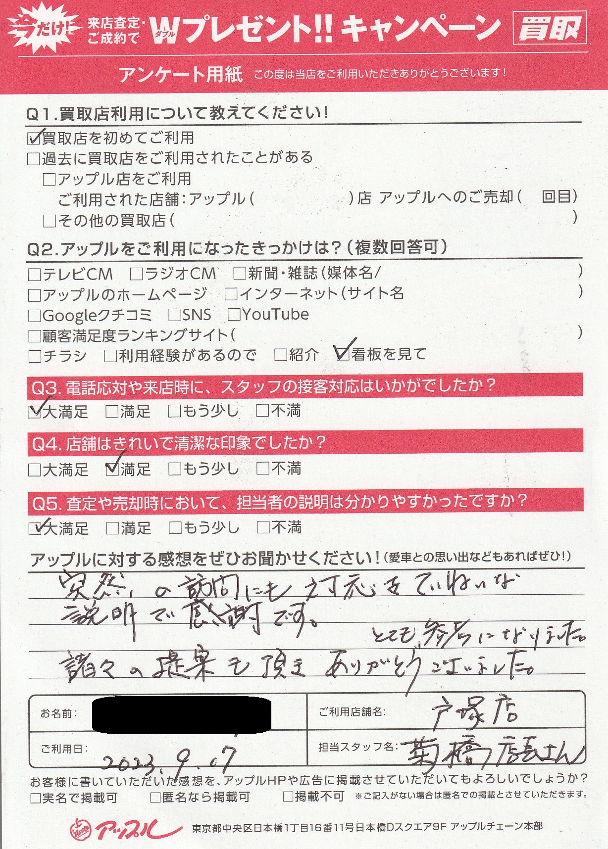 お車のご相談・ 査定だけでもOK! カンタン 入力 30秒 アップルがブランド買取始めました! お電話でも受付中! 受付時間10:00 ~ 19:00 045-828-2588 お車のご相談・ 査定だけでもOK! カンタン 入力 30秒 アップルがブランド買取始めました! お電話でも受付中! 受付時間10:00 ~ 19:00 045-828-2588 アップルがブランド買取始めました! お電話でも受付中! 受付時間10:00 ~ 19:00 045-828-2588 店舗情報 在庫車 スタッフ紹介 ブログ お客様の声 キャンペーン お得 無料査定 click お客様の声 ご記入日: 2023/09/17 T・S様 車名:スバル フォレスター Q.アップルに対する感想をぜひお聞かせください!突然の訪問にも対応をていねいな説明で感謝です。とても参考になりました。諸々の提案も頂きありがとうございました。 前へ 次へ お客様の声一覧を見る