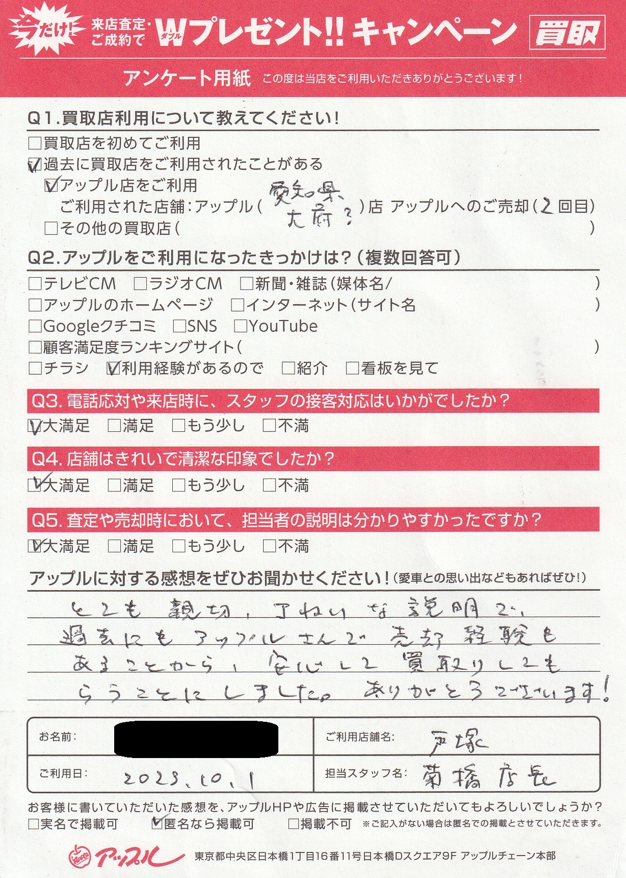 お車のご相談・ 査定だけでもOK! カンタン 入力 30秒 アップルがブランド買取始めました! お電話でも受付中! 受付時間10:00 ~ 19:00 045-828-2588 お車のご相談・ 査定だけでもOK! カンタン 入力 30秒 アップルがブランド買取始めました! お電話でも受付中! 受付時間10:00 ~ 19:00 045-828-2588 アップルがブランド買取始めました! お電話でも受付中! 受付時間10:00 ~ 19:00 045-828-2588 店舗情報 在庫車 スタッフ紹介 ブログ お客様の声 キャンペーン お得 無料査定 click お客様の声 ご記入日: 2023/10/01 T・W様 車名:トヨタ ハイエースバン Q.アップルに対する感想をぜひお聞かせください!とても親切、丁ねいな説明で過去にもアップルさんで売却経験もあることから、安心して買取してもらうことにしました。ありがとうございます! 前へ 次へ お客様の声一覧を見る