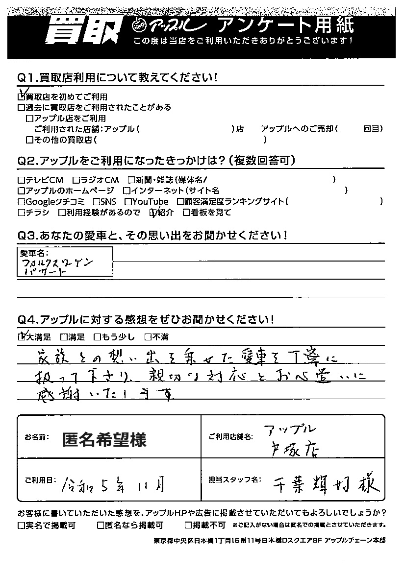 お車のご相談・ 査定だけでもOK! カンタン 入力 30秒 アップルがブランド買取始めました! お電話でも受付中! 受付時間10:00 ~ 19:00 045-828-2588 お車のご相談・ 査定だけでもOK! カンタン 入力 30秒 アップルがブランド買取始めました! お電話でも受付中! 受付時間10:00 ~ 19:00 045-828-2588 アップルがブランド買取始めました! お電話でも受付中! 受付時間10:00 ~ 19:00 045-828-2588 店舗情報 在庫車 スタッフ紹介 ブログ お客様の声 キャンペーン お得 無料査定 click お客様の声 ご記入日: 2024/02/21 匿名希望様 車名:フォルクスワーゲン パサート ご利用日:令和5年11月 担当:千葉輝好アップルに対する感想をぜひお聞かせください!家族との思い出を乗せた愛車を丁寧に扱って下さり、親切な対応とお心遣いに感謝いたします。 前へ 次へ お客様の声一覧を見る