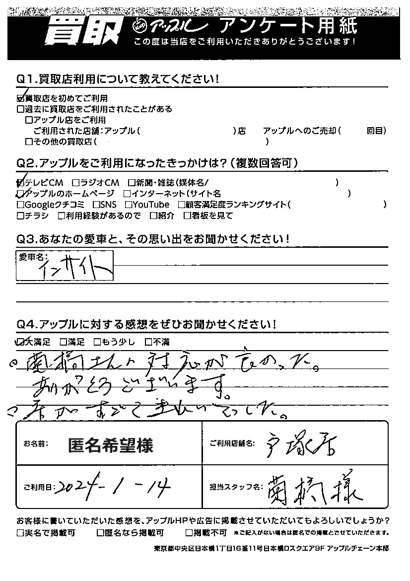 お車のご相談・ 査定だけでもOK! カンタン 入力 30秒 アップルがブランド買取始めました! お電話でも受付中! 受付時間10:00 ~ 19:00 045-828-2588 お車のご相談・ 査定だけでもOK! カンタン 入力 30秒 アップルがブランド買取始めました! お電話でも受付中! 受付時間10:00 ~ 19:00 045-828-2588 アップルがブランド買取始めました! お電話でも受付中! 受付時間10:00 ~ 19:00 045-828-2588 店舗情報 在庫車 スタッフ紹介 ブログ お客様の声 キャンペーン お得 無料査定 click お客様の声 ご記入日: 2024/02/25 匿名希望様 車名:ホンダ インサイト ご利用日:2024年1月14日 担当:菊橋アップルに対する感想をぜひお聞かせください!菊橋さんの対応が良かった。ありがとうございます。店がすごくきれいだった。 前へ 次へ お客様の声一覧を見る