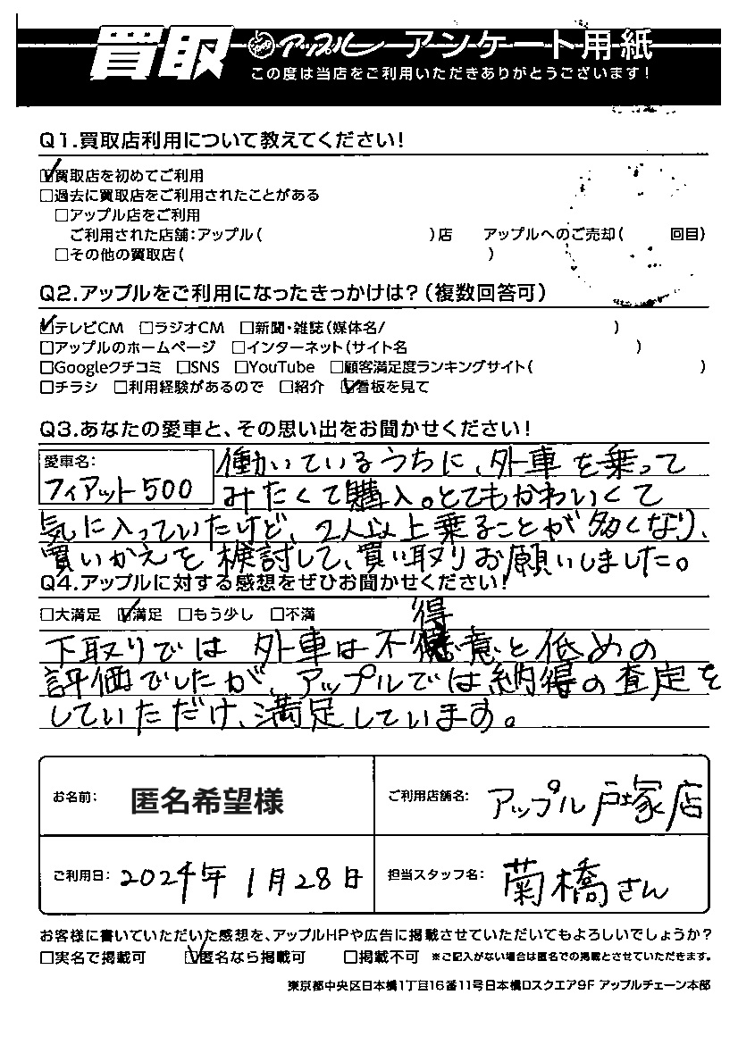 匿名希望様 車名:フィアット 500(チンクエチェント)