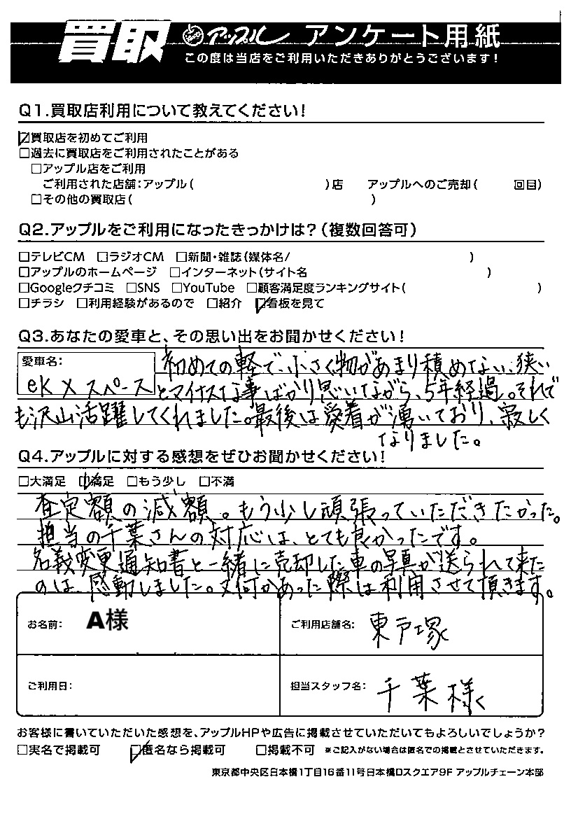 A.愛車名:EKクロススペース 初めての軽自動車で小さく物があまり積めない、狭いとマイナスな事ばかり思いながら5年経過。それでも沢山活躍してくれました。最後は愛着が湧いており、淋しくなりました。