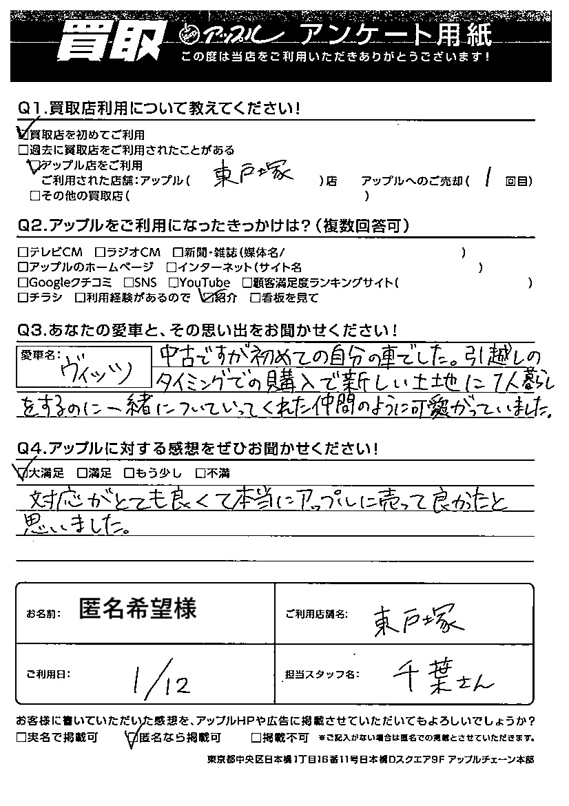 匿名希望様 車名:トヨタ ヴィッツ