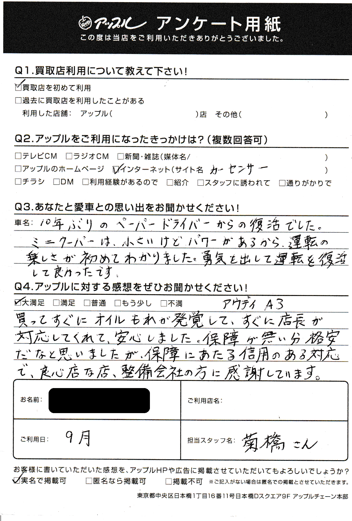 買ってすぐにオイル漏れが発覚して、すぐに店長が対応してくれて、安心しました。