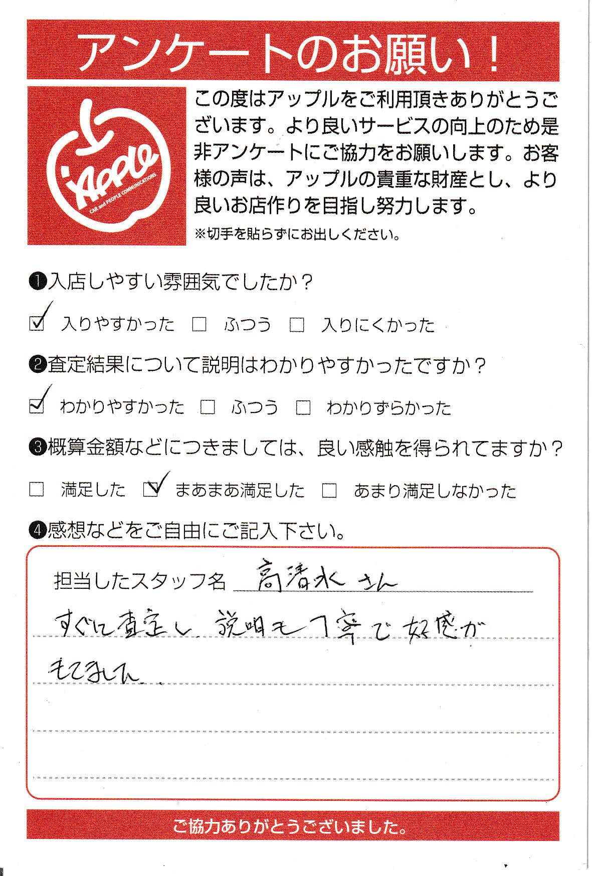 お車のご相談・ 査定だけでもOK! カンタン 入力 30秒 アップルがブランド買取始めました! お電話でも受付中! 受付時間10:00 ~ 19:00 045-828-2588 お車のご相談・ 査定だけでもOK! カンタン 入力 30秒 アップルがブランド買取始めました! お電話でも受付中! 受付時間10:00 ~ 19:00 045-828-2588 アップルがブランド買取始めました! お電話でも受付中! 受付時間10:00 ~ 19:00 045-828-2588 店舗情報 在庫車 スタッフ紹介 ブログ お客様の声 キャンペーン お得 無料査定 click お客様の声 ご記入日: 2020/12/17 K・N様 車名:マツダ RX-8 【アップルに対する感想をぜひお聞かせください】すぐに査定し、説明も丁寧で好感がもてました。 前へ 次へ お客様の声一覧を見る