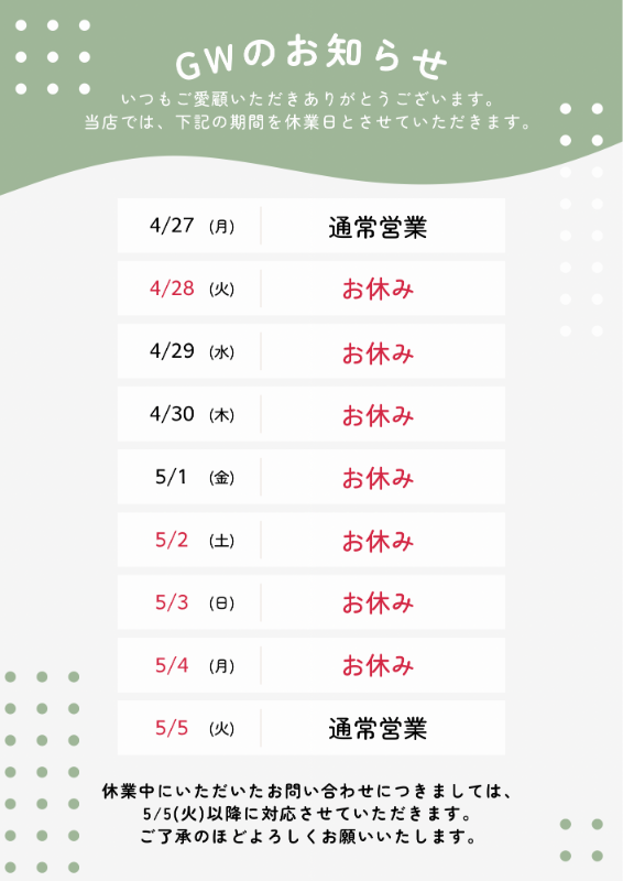 お車のご相談・ 査定だけでもOK! カンタン 入力 30秒 アップルがブランド買取始めました! お電話でも受付中! 受付時間10:00~19:00 03-6662-6181 お車のご相談・ 査定だけでもOK! カンタン 入力 30秒 アップルがブランド買取始めました! お電話でも受付中! 受付時間10:00~19:00 03-6662-6181 アップルがブランド買取始めました! お電話でも受付中! 受付時間10:00~19:00 03-6662-6181 店舗情報 在庫車 スタッフ紹介 ブログ お客様の声 キャンペーン 無料査定 click [ つぶやき ] 2026/04/18 (土) 11:47 GW休業のお知らせ 平素より、 アップル葛飾店 をご愛顧頂きまして、誠にありがとうございます。弊店は、令和8年(2026年)4月28日(火)より5月4日(月)まで、ゴールデンウィークのお休みとさせて頂きます。5月5日(火)より、通常営業致しますので、どうぞよろしくお願い申し上げます。※休業期間中のお問い合わせにつきましては、営業再開後に順次対応させていただきます。お客様にはご不便をおかけしていたしますが、何卒ご理解のほどよろしくお願い申し上げます。 2026-04-18 11:47:00 新しい記事へ 古い記事へ 最新記事 つつじ咲きました!GW休業のお知らせカローラクロスHV入庫しました!ノアHV入庫しました!フリードスパイク入庫しました! 店舗情報に戻る 月別アーカイブ 2026年04月(10)2026年03月(6)