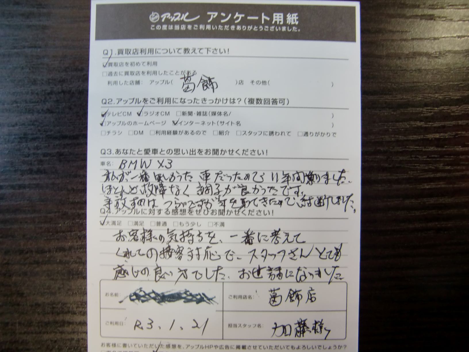 お車のご相談・ 査定だけでもOK! カンタン 入力 30秒 アップルがブランド買取始めました! お電話でも受付中! 受付時間10:00~19:00 03-6662-6181 お車のご相談・ 査定だけでもOK! カンタン 入力 30秒 アップルがブランド買取始めました! お電話でも受付中! 受付時間10:00~19:00 03-6662-6181 アップルがブランド買取始めました! お電話でも受付中! 受付時間10:00~19:00 03-6662-6181 店舗情報 在庫車 スタッフ紹介 ブログ お客様の声 キャンペーン 無料査定 click お客様の声 ご記入日: 2021/01/21 W様 車名:BMW X3 前へ 次へ お客様の声一覧を見る