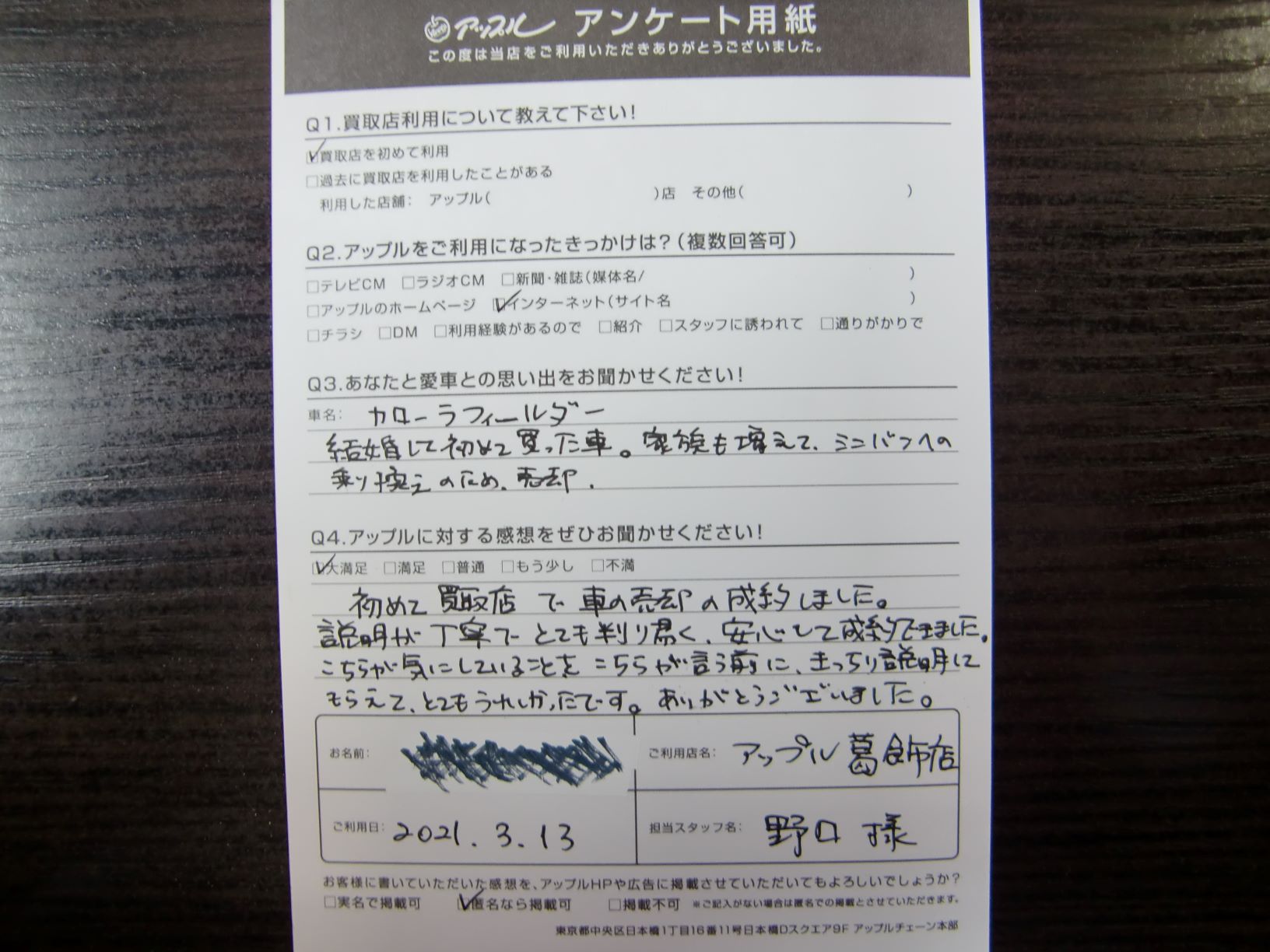 お車のご相談・ 査定だけでもOK! カンタン 入力 30秒 アップルがブランド買取始めました! お電話でも受付中! 受付時間10:00~19:00 03-6662-6181 お車のご相談・ 査定だけでもOK! カンタン 入力 30秒 アップルがブランド買取始めました! お電話でも受付中! 受付時間10:00~19:00 03-6662-6181 アップルがブランド買取始めました! お電話でも受付中! 受付時間10:00~19:00 03-6662-6181 店舗情報 在庫車 スタッフ紹介 ブログ お客様の声 キャンペーン 無料査定 click お客様の声 ご記入日: 2021/03/13 O様 車名:トヨタ カローラフィールダー フィールダー(カローラ) 前へ 次へ お客様の声一覧を見る