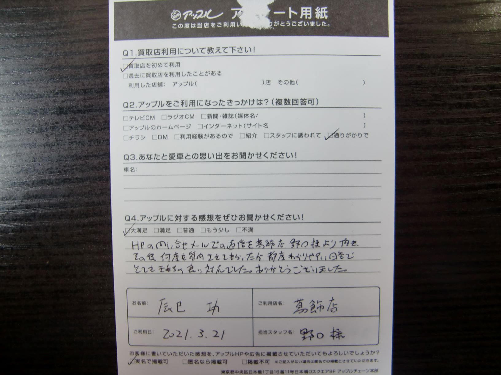 お車のご相談・ 査定だけでもOK! カンタン 入力 30秒 アップルがブランド買取始めました! お電話でも受付中! 受付時間10:00~19:00 03-6662-6181 お車のご相談・ 査定だけでもOK! カンタン 入力 30秒 アップルがブランド買取始めました! お電話でも受付中! 受付時間10:00~19:00 03-6662-6181 アップルがブランド買取始めました! お電話でも受付中! 受付時間10:00~19:00 03-6662-6181 店舗情報 在庫車 スタッフ紹介 ブログ お客様の声 キャンペーン 無料査定 click お客様の声 ご記入日: 2021/03/21 辰巳 功様 車名:日産 セレナ 前へ 次へ お客様の声一覧を見る