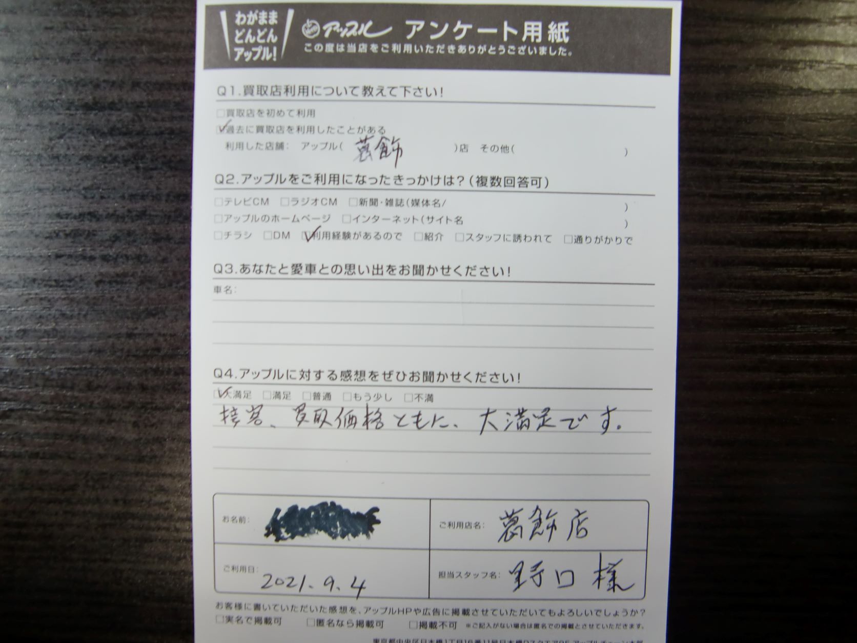 お車のご相談・ 査定だけでもOK! カンタン 入力 30秒 アップルがブランド買取始めました! お電話でも受付中! 受付時間10:00~19:00 03-6662-6181 お車のご相談・ 査定だけでもOK! カンタン 入力 30秒 アップルがブランド買取始めました! お電話でも受付中! 受付時間10:00~19:00 03-6662-6181 アップルがブランド買取始めました! お電話でも受付中! 受付時間10:00~19:00 03-6662-6181 店舗情報 在庫車 スタッフ紹介 ブログ お客様の声 キャンペーン 無料査定 click お客様の声 ご記入日: 2021/09/04 K様 車名:ホンダ N-WGN 前へ 次へ お客様の声一覧を見る