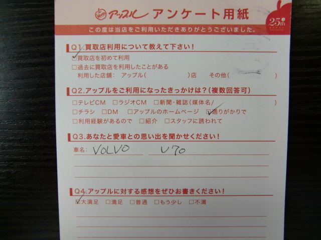 お車のご相談・ 査定だけでもOK! カンタン 入力 30秒 アップルがブランド買取始めました! お電話でも受付中! 受付時間10:00~19:00 03-6662-6181 お車のご相談・ 査定だけでもOK! カンタン 入力 30秒 アップルがブランド買取始めました! お電話でも受付中! 受付時間10:00~19:00 03-6662-6181 アップルがブランド買取始めました! お電話でも受付中! 受付時間10:00~19:00 03-6662-6181 店舗情報 在庫車 スタッフ紹介 ブログ お客様の声 キャンペーン 無料査定 click お客様の声 ご記入日: 2014/03/16 G様 VOLVO V70 前へ 次へ お客様の声一覧を見る