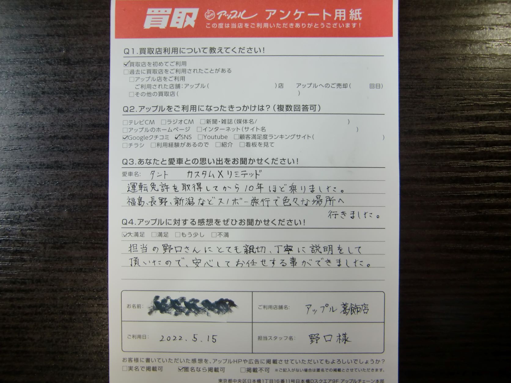 お車のご相談・ 査定だけでもOK! カンタン 入力 30秒 アップルがブランド買取始めました! お電話でも受付中! 受付時間10:00~19:00 03-6662-6181 お車のご相談・ 査定だけでもOK! カンタン 入力 30秒 アップルがブランド買取始めました! お電話でも受付中! 受付時間10:00~19:00 03-6662-6181 アップルがブランド買取始めました! お電話でも受付中! 受付時間10:00~19:00 03-6662-6181 店舗情報 在庫車 スタッフ紹介 ブログ お客様の声 キャンペーン 無料査定 click お客様の声 ご記入日: 2022/05/15 I様 車名:ダイハツ タント 前へ 次へ お客様の声一覧を見る