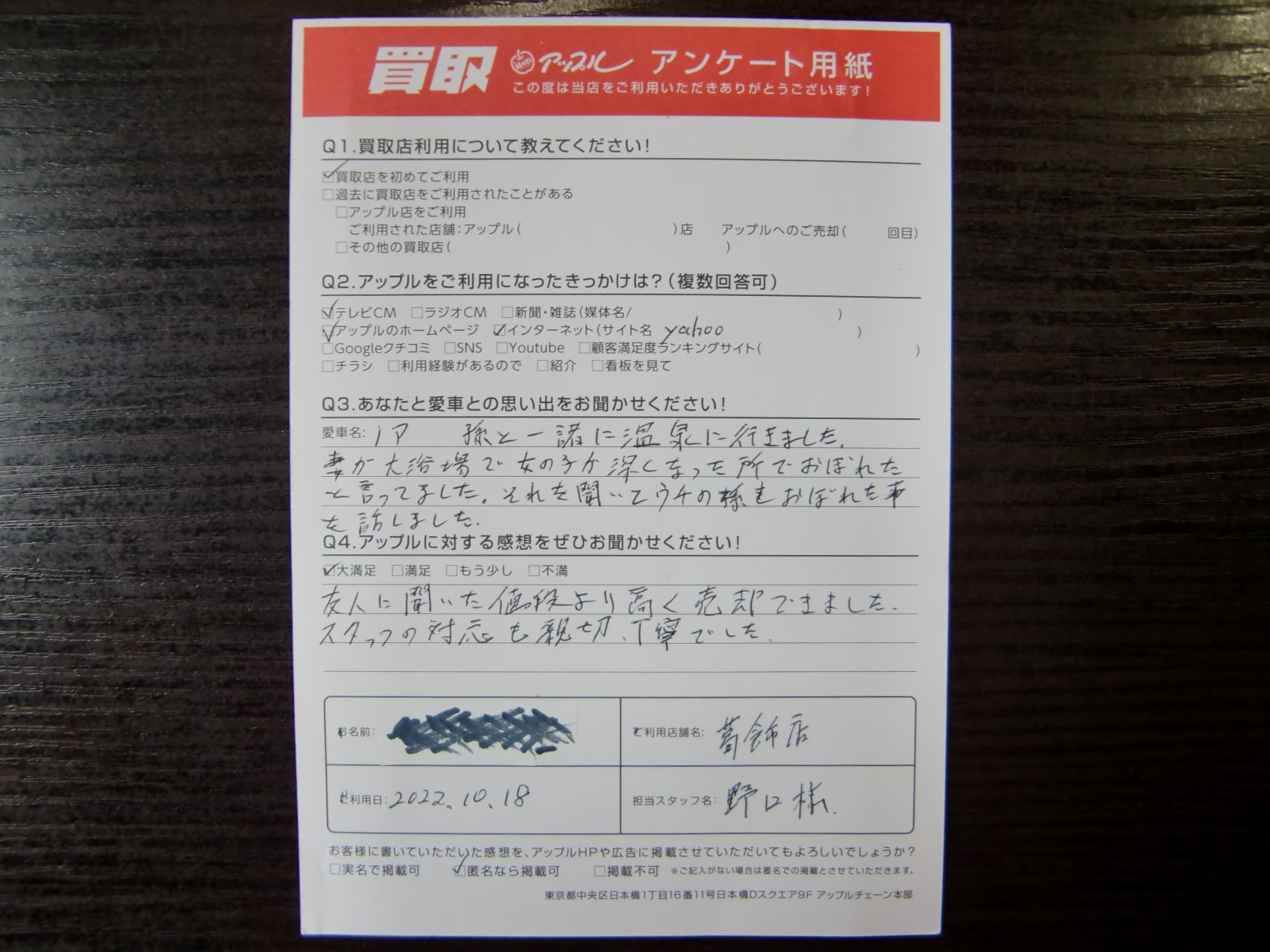 お車のご相談・ 査定だけでもOK! カンタン 入力 30秒 アップルがブランド買取始めました! お電話でも受付中! 受付時間10:00~19:00 03-6662-6181 お車のご相談・ 査定だけでもOK! カンタン 入力 30秒 アップルがブランド買取始めました! お電話でも受付中! 受付時間10:00~19:00 03-6662-6181 アップルがブランド買取始めました! お電話でも受付中! 受付時間10:00~19:00 03-6662-6181 店舗情報 在庫車 スタッフ紹介 ブログ お客様の声 キャンペーン 無料査定 click お客様の声 ご記入日: 2022/10/18 Y様 車名:トヨタ ノア 前へ 次へ お客様の声一覧を見る