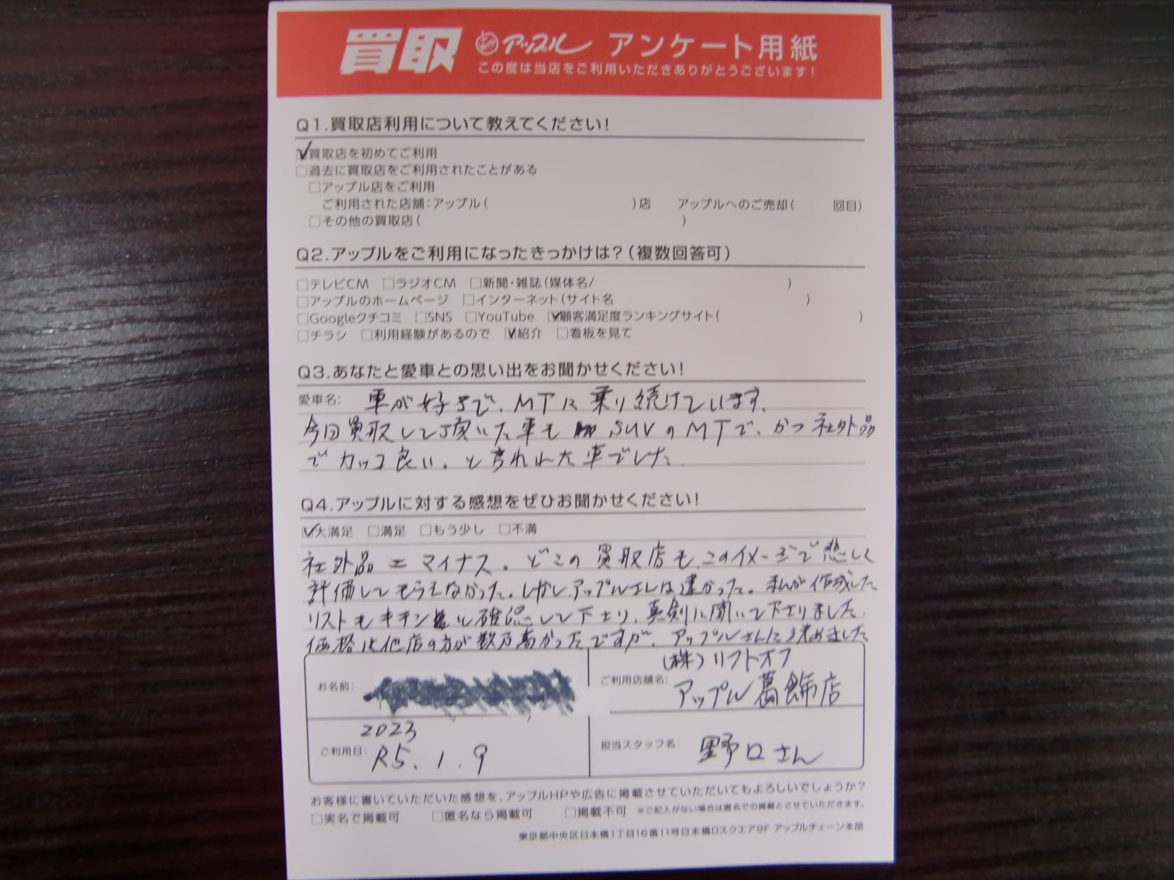 お車のご相談・ 査定だけでもOK! カンタン 入力 30秒 アップルがブランド買取始めました! お電話でも受付中! 受付時間10:00~19:00 03-6662-6181 お車のご相談・ 査定だけでもOK! カンタン 入力 30秒 アップルがブランド買取始めました! お電話でも受付中! 受付時間10:00~19:00 03-6662-6181 アップルがブランド買取始めました! お電話でも受付中! 受付時間10:00~19:00 03-6662-6181 店舗情報 在庫車 スタッフ紹介 ブログ お客様の声 キャンペーン 無料査定 click お客様の声 ご記入日: 2023/01/09 Y様 車名:マツダ CX-5 前へ 次へ お客様の声一覧を見る