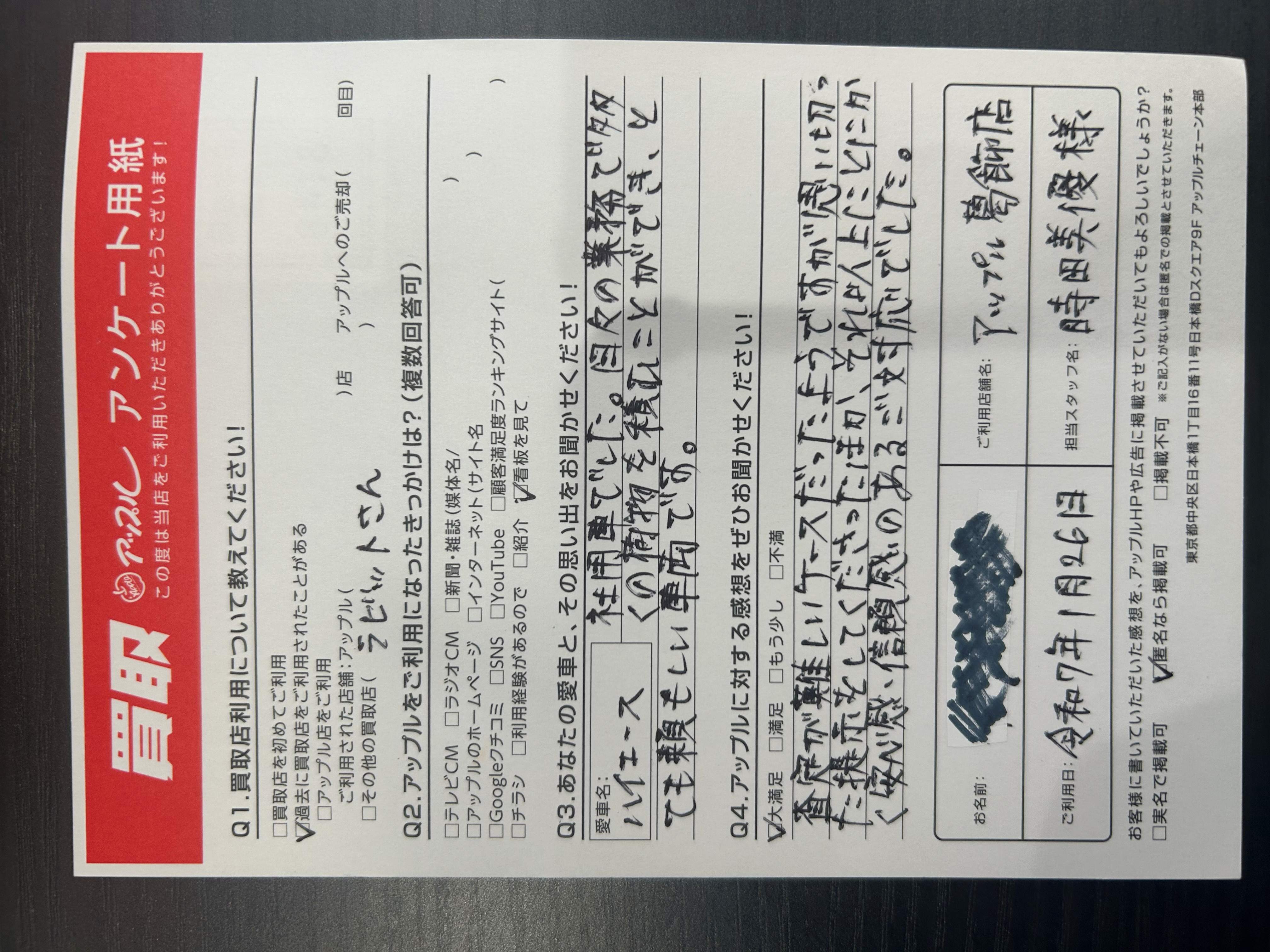 お車のご相談・ 査定だけでもOK! カンタン 入力 30秒 アップルがブランド買取始めました! お電話でも受付中! 受付時間10:00~19:00 03-6662-6181 お車のご相談・ 査定だけでもOK! カンタン 入力 30秒 アップルがブランド買取始めました! お電話でも受付中! 受付時間10:00~19:00 03-6662-6181 アップルがブランド買取始めました! お電話でも受付中! 受付時間10:00~19:00 03-6662-6181 店舗情報 在庫車 スタッフ紹介 ブログ お客様の声 キャンペーン お得 無料査定 click お客様の声 ご記入日: 2025/01/26 K様 車名:トヨタ ハイエースバン 査定が難しいケースだったようですが思い切った提示をしてくださったほか、それ以上にとにかく安心感・信頼感のあるご対応でした。 前へ 次へ お客様の声一覧を見る