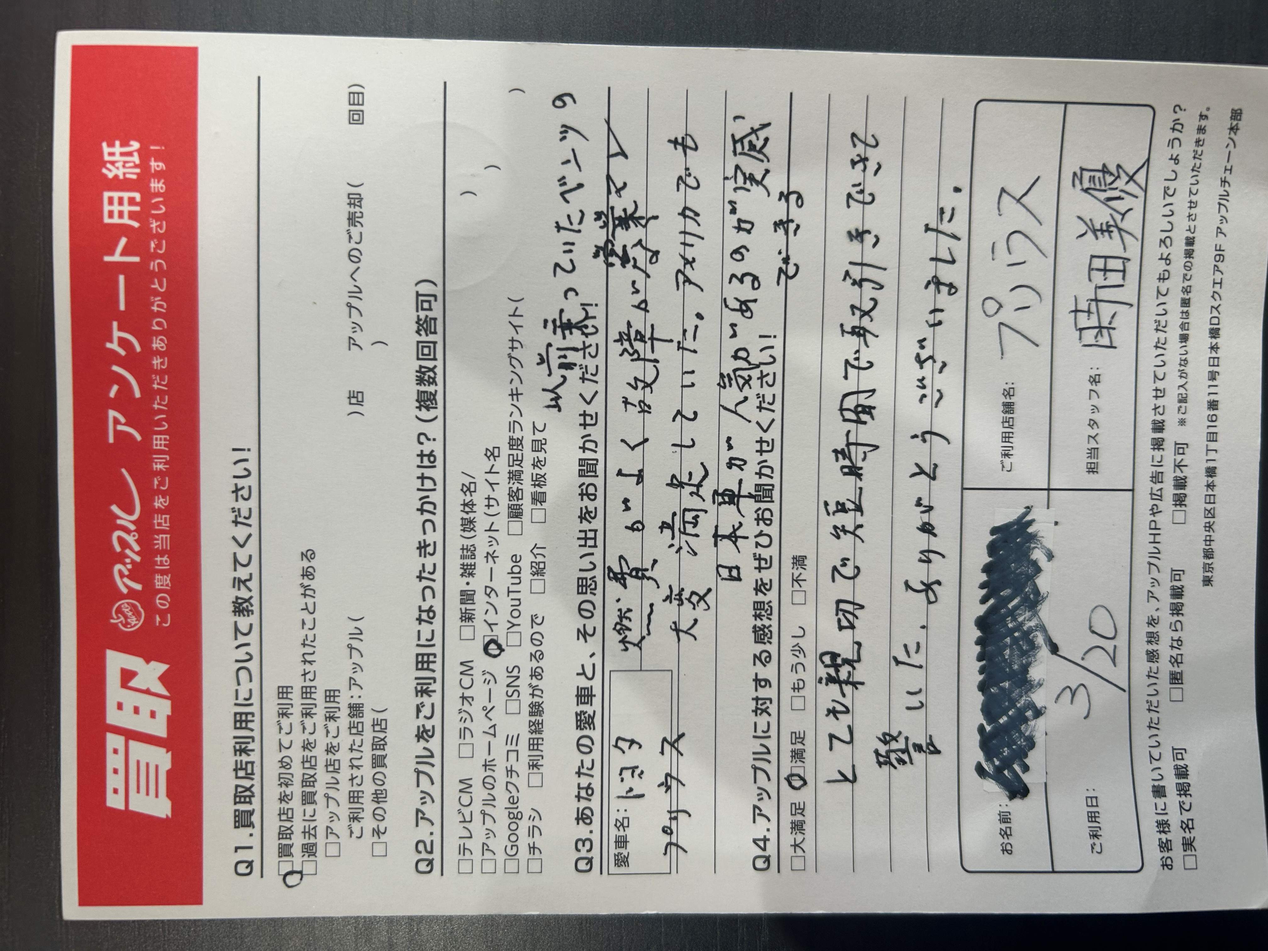 お車のご相談・ 査定だけでもOK! カンタン 入力 30秒 アップルがブランド買取始めました! お電話でも受付中! 受付時間10:00~19:00 03-6662-6181 お車のご相談・ 査定だけでもOK! カンタン 入力 30秒 アップルがブランド買取始めました! お電話でも受付中! 受付時間10:00~19:00 03-6662-6181 アップルがブランド買取始めました! お電話でも受付中! 受付時間10:00~19:00 03-6662-6181 店舗情報 在庫車 スタッフ紹介 ブログ お客様の声 キャンペーン お得 無料査定 click お客様の声 ご記入日: 2025/03/20 M様 車名:トヨタ プリウス(2023年3月~のPHVを含む) とても親切で短時間で取引できて驚いた。ありがとうございました。 前へ 次へ お客様の声一覧を見る