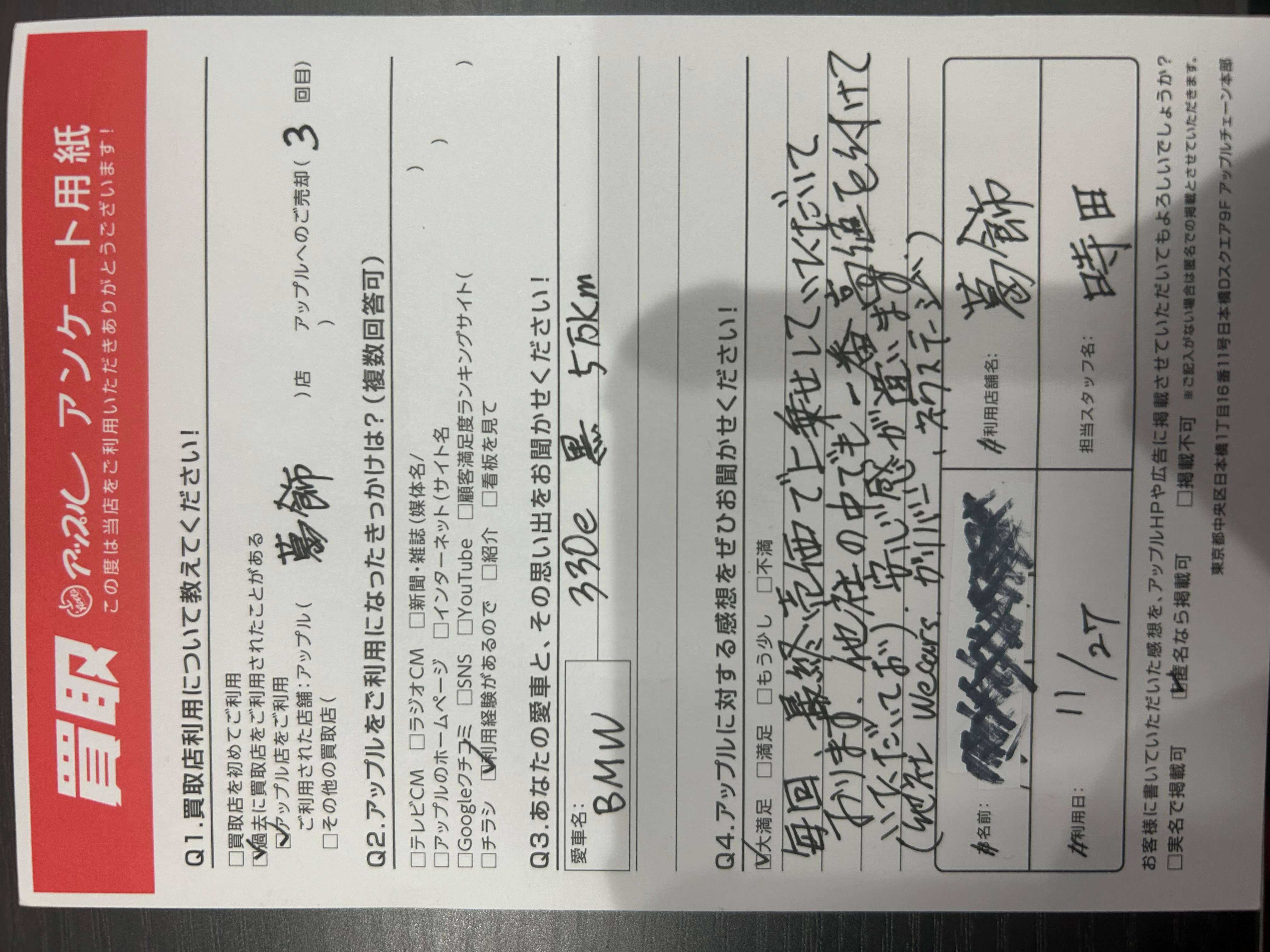 お車のご相談・ 査定だけでもOK! カンタン 入力 30秒 アップルがブランド買取始めました! お電話でも受付中! 受付時間10:00~19:00 03-6662-6181 お車のご相談・ 査定だけでもOK! カンタン 入力 30秒 アップルがブランド買取始めました! お電話でも受付中! 受付時間10:00~19:00 03-6662-6181 アップルがブランド買取始めました! お電話でも受付中! 受付時間10:00~19:00 03-6662-6181 店舗情報 在庫車 スタッフ紹介 ブログ お客様の声 キャンペーン お得 無料査定 click お客様の声 ご記入日: 2025/11/27 S様 車名:BMW 3シリーズセダン 毎回、最終売価で上乗せしていただいております。他社の中でも一番高値を付けていただいており、安心感が違います。 前へ 次へ お客様の声一覧を見る