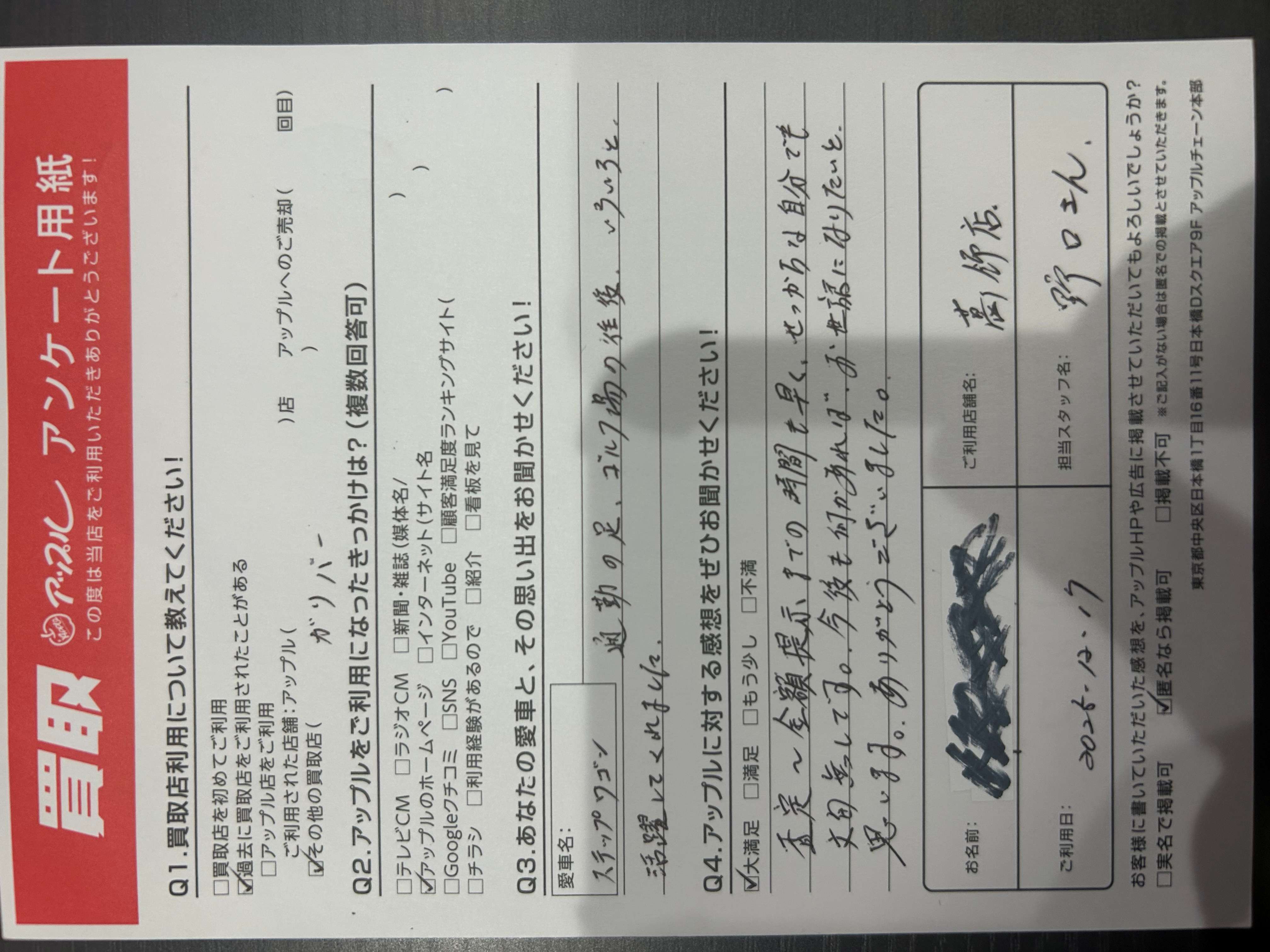 お車のご相談・ 査定だけでもOK! カンタン 入力 30秒 アップルがブランド買取始めました! お電話でも受付中! 受付時間10:00~19:00 03-6662-6181 お車のご相談・ 査定だけでもOK! カンタン 入力 30秒 アップルがブランド買取始めました! お電話でも受付中! 受付時間10:00~19:00 03-6662-6181 アップルがブランド買取始めました! お電話でも受付中! 受付時間10:00~19:00 03-6662-6181 店舗情報 在庫車 スタッフ紹介 ブログ お客様の声 キャンペーン お得 無料査定 click お客様の声 ご記入日: 2025/12/17 M様 車名:ホンダ ステップワゴン 査定~金額提示までの時間も早く、せっかちな自分でも文句無しです。今後も何かあれば、お世話になりたいと思います。ありがとうございました。 前へ 次へ お客様の声一覧を見る
