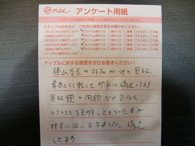 横山店長の対応が他の買取業者と比較して非常に満足しています。買取額の問題だけでなく、いろいろと説明してもらった事が非常に役に立ちました。満足してます。