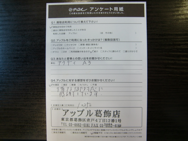 お車のご相談・ 査定だけでもOK! カンタン 入力 30秒 アップルがブランド買取始めました! お電話でも受付中! 受付時間10:00~19:00 03-6662-6181 お車のご相談・ 査定だけでもOK! カンタン 入力 30秒 アップルがブランド買取始めました! お電話でも受付中! 受付時間10:00~19:00 03-6662-6181 アップルがブランド買取始めました! お電話でも受付中! 受付時間10:00~19:00 03-6662-6181 店舗情報 在庫車 スタッフ紹介 ブログ お客様の声 キャンペーン 無料査定 click お客様の声 ご記入日: 2017/01/25 U様 車名:アウディ A3 前へ 次へ お客様の声一覧を見る
