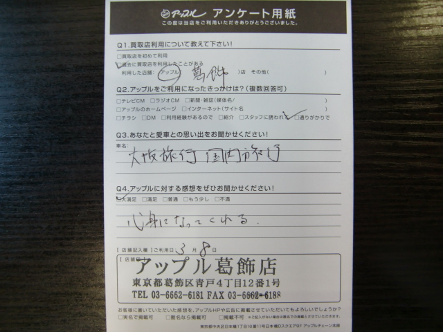 お車のご相談・ 査定だけでもOK! カンタン 入力 30秒 アップルがブランド買取始めました! お電話でも受付中! 受付時間10:00~19:00 03-6662-6181 お車のご相談・ 査定だけでもOK! カンタン 入力 30秒 アップルがブランド買取始めました! お電話でも受付中! 受付時間10:00~19:00 03-6662-6181 アップルがブランド買取始めました! お電話でも受付中! 受付時間10:00~19:00 03-6662-6181 店舗情報 在庫車 スタッフ紹介 ブログ お客様の声 キャンペーン 無料査定 click お客様の声 ご記入日: 2017/03/08 M様 車名:トヨタ ノア 前へ 次へ お客様の声一覧を見る