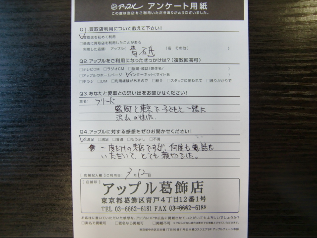 お車のご相談・ 査定だけでもOK! カンタン 入力 30秒 アップルがブランド買取始めました! お電話でも受付中! 受付時間10:00~19:00 03-6662-6181 お車のご相談・ 査定だけでもOK! カンタン 入力 30秒 アップルがブランド買取始めました! お電話でも受付中! 受付時間10:00~19:00 03-6662-6181 アップルがブランド買取始めました! お電話でも受付中! 受付時間10:00~19:00 03-6662-6181 店舗情報 在庫車 スタッフ紹介 ブログ お客様の声 キャンペーン 無料査定 click お客様の声 ご記入日: 2017/03/12 N様 車名:ホンダ フリード(H28年9月以降のハイブリッド含む) 前へ 次へ お客様の声一覧を見る