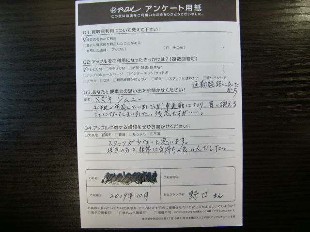 お車のご相談・ 査定だけでもOK! カンタン 入力 30秒 アップルがブランド買取始めました! お電話でも受付中! 受付時間10:00~19:00 03-6662-6181 お車のご相談・ 査定だけでもOK! カンタン 入力 30秒 アップルがブランド買取始めました! お電話でも受付中! 受付時間10:00~19:00 03-6662-6181 アップルがブランド買取始めました! お電話でも受付中! 受付時間10:00~19:00 03-6662-6181 店舗情報 在庫車 スタッフ紹介 ブログ お客様の声 キャンペーン 無料査定 click お客様の声 ご記入日: 2019/10/13 K様 車名:スズキ ジムニー 前へ 次へ お客様の声一覧を見る