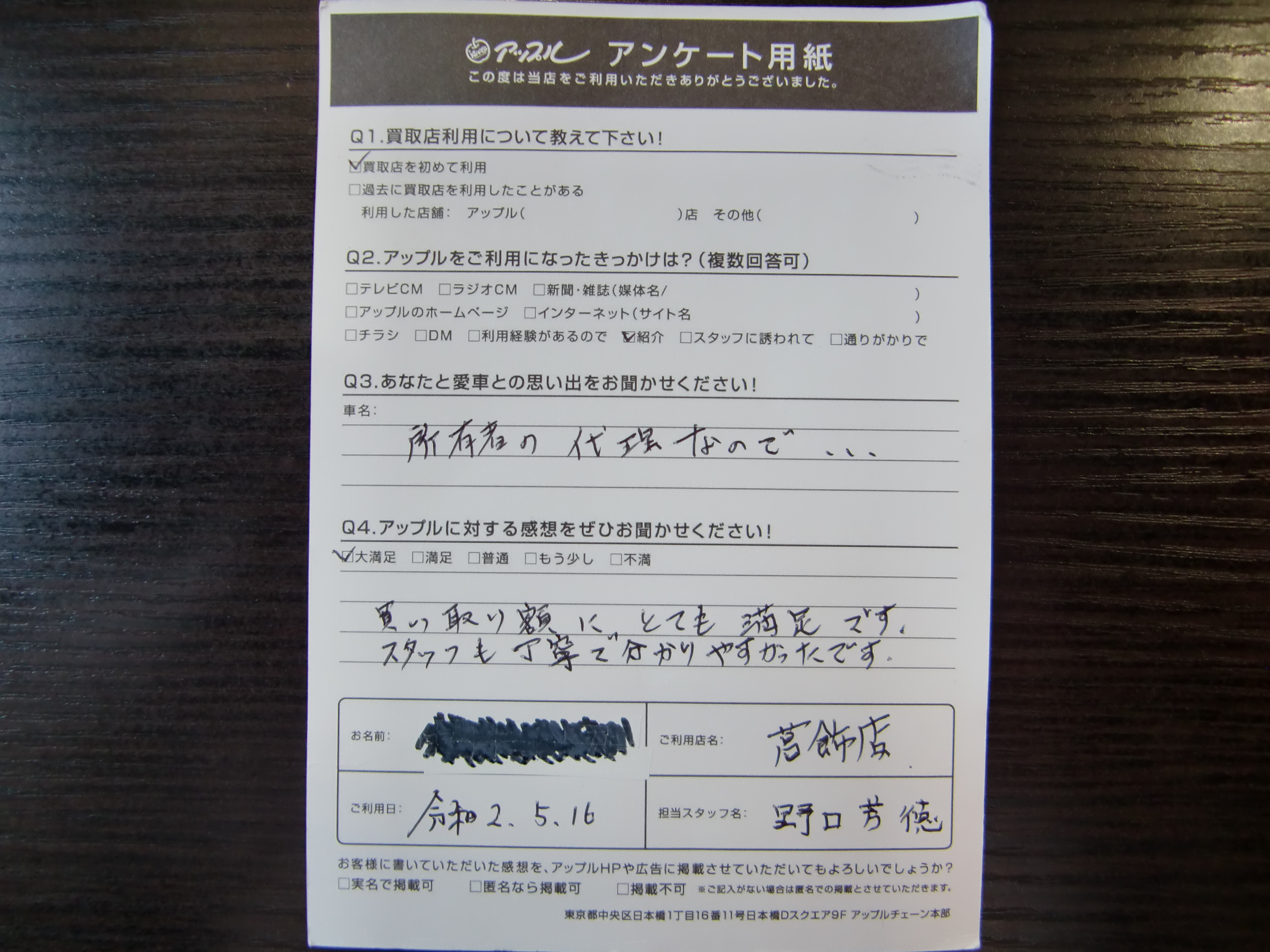 お車のご相談・ 査定だけでもOK! カンタン 入力 30秒 アップルがブランド買取始めました! お電話でも受付中! 受付時間10:00~19:00 03-6662-6181 お車のご相談・ 査定だけでもOK! カンタン 入力 30秒 アップルがブランド買取始めました! お電話でも受付中! 受付時間10:00~19:00 03-6662-6181 アップルがブランド買取始めました! お電話でも受付中! 受付時間10:00~19:00 03-6662-6181 店舗情報 在庫車 スタッフ紹介 ブログ お客様の声 キャンペーン 無料査定 click お客様の声 ご記入日: 2020/05/16 N様 車名:ダイハツ アトレーワゴン 前へ 次へ お客様の声一覧を見る