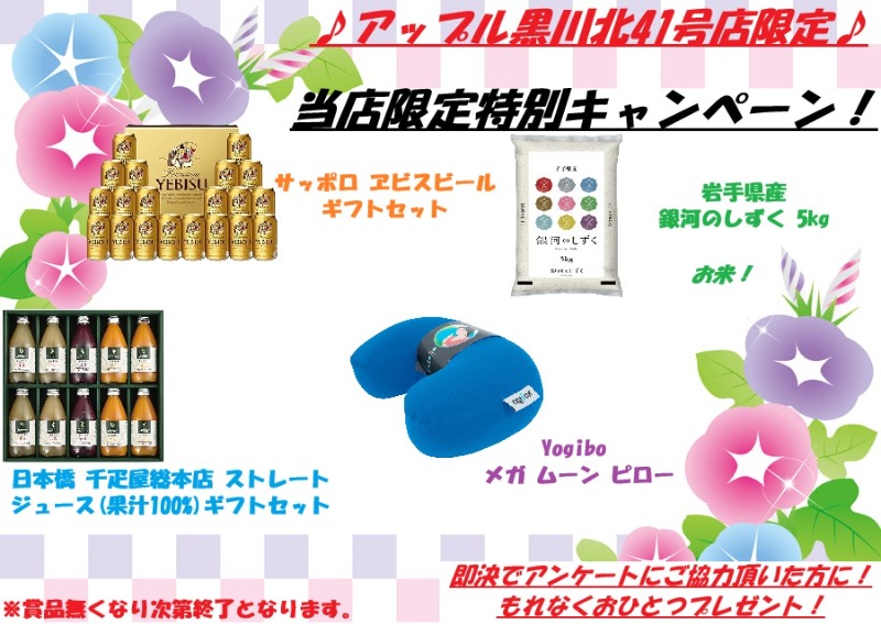 お車のご相談・ 査定だけでもOK! カンタン 入力 30秒 アップルがブランド買取始めました! お電話でも受付中! 受付時間10:00~19:00 ※毎週水曜定休日 052-508-9641 お車のご相談・ 査定だけでもOK! カンタン 入力 30秒 アップルがブランド買取始めました! お電話でも受付中! 受付時間10:00~19:00 ※毎週水曜定休日 052-508-9641 アップルがブランド買取始めました! お電話でも受付中! 受付時間10:00~19:00 ※毎週水曜定休日 052-508-9641 店舗情報 在庫車 スタッフ紹介 ブログ お客様の声 キャンペーン お得 無料査定 click [ 未分類 ] 2025/05/31 (土) 10:00 新たなキャンペーン始まります! アップル黒川北41号店のブログをご覧の皆様こんにちは!副店長の塩道です!気づけばもう5月も最終日です!!月日が過ぎるのはあっという間ですね~!さて、本日は皆様に大変お得なキャンペーンのご案内デス!!アップル黒川北41号店限定 特別キャンペーン!期間中、即決でご成約頂いた方で!アンケートにご協力いただいた方に!もれなくおひとつプレゼント!!賞品在庫もしっかりご用意させて頂いております!!是非この機会に当店をご利用下さい!※賞品無くなり次第終了となりますので予めご了承ください。以上シオミチでした~! 2025-05-31 10:00:00 新しい記事へ 古い記事へ 最新記事 大切なお知らせが2つあります!さくらんぼの!ナン!メロン!キャンペーン好評開催中です! 店舗情報に戻る 月別アーカイブ 2026年04月(14)2026年03月(27)2026年02月(24)2026年01月(23)2025年12月(23)2025年11月(26)2025年10月(26)2025年09月(25)2025年08月(19)2025年07月(23)2025年06月(22)2025年05月(15)2025年04月(20)2025年03月(24)2025年02月(21)2025年01月(21)2024年12月(20)2024年11月(22)2024年10月(23)2024年09月(23)2024年08月(19)2024年07月(23)2024年06月(22)2024年05月(21)2024年04月(21)2024年03月(25)2024年02月(24)2024年01月(21)2023年12月(20)2023年11月(22)2023年10月(23)2023年09月(22)2023年08月(11)2023年07月(23)2023年06月(23)2023年05月(20)2023年04月(24)2023年03月(24)2023年02月(21)2023年01月(22)2022年12月(23)2022年11月(25)2022年10月(24)2022年09月(23)2022年08月(19)2022年07月(19)2022年06月(24)2022年05月(20)2022年04月(22)2022年03月(25)2022年02月(22)2022年01月(23)2021年12月(20)2021年11月(24)2021年10月(24)2021年09月(23)2021年08月(21)2021年07月(24)2021年06月(22)2021年05月(21)2021年04月(21)2021年03月(24)2021年02月(23)2021年01月(21)2020年12月(21)2020年11月(23)2020年10月(25)2020年09月(11)2020年08月(10)2020年07月(12)2020年06月(16)2020年05月(4)2020年04月(6)2020年03月(4)2020年02月(5)2020年01月(7)2019年12月(3)2019年11月(3)2019年10月(4)2019年09月(4)2019年08月(3)2019年07月(3)2019年06月(3)2019年05月(3)2019年04月(3)2019年03月(3)2019年02月(2)2019年01月(3)2018年12月(3)2018年11月(4)2018年10月(4)2018年09月(5)2018年08月(7)2018年07月(7)2018年06月(8)2018年05月(8)2018年04月(6)2018年03月(7)2018年02月(3)2018年01月(7)2017年12月(6)2017年11月(7)2017年10月(4)2017年09月(4)2017年08月(4)2017年07月(4)2017年06月(7)2017年05月(4)2017年04月(4)2017年03月(2)2017年02月(3)2017年01月(8)2016年12月(8)2016年11月(8)2016年10月(10)2016年09月(8)2016年08月(9)2016年07月(9)2016年06月(10)2016年05月(8)2016年04月(4)2016年03月(2)2016年02月(4)2016年01月(5)2015年12月(6)2015年11月(4)2015年10月(6)2015年09月(4)2015年08月(10)2015年07月(4)2015年06月(7)2015年05月(4)2015年04月(5)2015年03月(2)2015年02月(3)2015年01月(7)2014年12月(8)2014年11月(9)2014年10月(9)2014年09月(8)2014年08月(7)2014年07月(10)2014年06月(9)2014年05月(10)2014年04月(10)2014年03月(1)2014年02月(2)2014年01月(2)2013年12月(7)2013年11月(3)2013年10月(6)2013年09月(7)2013年08月(2)