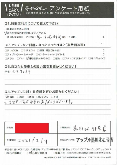 お車のご相談・ 査定だけでもOK! カンタン 入力 30秒 アップルがブランド買取始めました! お電話でも受付中! 受付時間10:00~19:00 ※毎週水曜定休日 052-508-9641 お車のご相談・ 査定だけでもOK! カンタン 入力 30秒 アップルがブランド買取始めました! お電話でも受付中! 受付時間10:00~19:00 ※毎週水曜定休日 052-508-9641 アップルがブランド買取始めました! お電話でも受付中! 受付時間10:00~19:00 ※毎週水曜定休日 052-508-9641 店舗情報 在庫車 スタッフ紹介 ブログ お客様の声 キャンペーン お得 無料査定 click お客様の声 ご記入日: 2021/02/07 匿名希望エスクァイア様 車名:トヨタ エスクァイア 2回目ですが本当にありがとうございます。 前へ 次へ お客様の声一覧を見る
