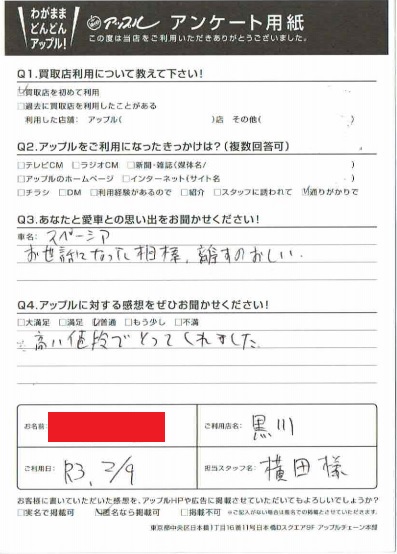 お車のご相談・ 査定だけでもOK! カンタン 入力 30秒 アップルがブランド買取始めました! お電話でも受付中! 受付時間10:00~19:00 ※毎週水曜定休日 052-508-9641 お車のご相談・ 査定だけでもOK! カンタン 入力 30秒 アップルがブランド買取始めました! お電話でも受付中! 受付時間10:00~19:00 ※毎週水曜定休日 052-508-9641 アップルがブランド買取始めました! お電話でも受付中! 受付時間10:00~19:00 ※毎週水曜定休日 052-508-9641 店舗情報 在庫車 スタッフ紹介 ブログ お客様の声 キャンペーン お得 無料査定 click お客様の声 ご記入日: 2021/02/09 匿名希望スペーシア様 車名:スズキ スペーシア お世話になった相棒、離すのおしい。高い値段でとってくれました。 前へ 次へ お客様の声一覧を見る