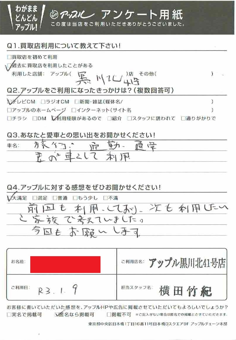 お車のご相談・ 査定だけでもOK! カンタン 入力 30秒 アップルがブランド買取始めました! お電話でも受付中! 受付時間10:00~19:00 ※毎週水曜定休日 052-508-9641 お車のご相談・ 査定だけでもOK! カンタン 入力 30秒 アップルがブランド買取始めました! お電話でも受付中! 受付時間10:00~19:00 ※毎週水曜定休日 052-508-9641 アップルがブランド買取始めました! お電話でも受付中! 受付時間10:00~19:00 ※毎週水曜定休日 052-508-9641 店舗情報 在庫車 スタッフ紹介 ブログ お客様の声 キャンペーン お得 無料査定 click お客様の声 ご記入日: 2021/01/09 匿名希望キューブ様 車名:日産 キューブ 前回も利用しており、次も利用したいと家族で考えていました。今回もお願いします。 前へ 次へ お客様の声一覧を見る