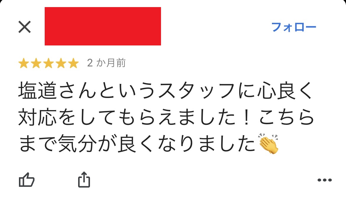 お車のご相談・ 査定だけでもOK! カンタン 入力 30秒 アップルがブランド買取始めました! お電話でも受付中! 受付時間10:00~19:00 ※毎週水曜定休日 052-508-9641 お車のご相談・ 査定だけでもOK! カンタン 入力 30秒 アップルがブランド買取始めました! お電話でも受付中! 受付時間10:00~19:00 ※毎週水曜定休日 052-508-9641 アップルがブランド買取始めました! お電話でも受付中! 受付時間10:00~19:00 ※毎週水曜定休日 052-508-9641 店舗情報 在庫車 スタッフ紹介 ブログ お客様の声 キャンペーン お得 無料査定 click お客様の声 ご記入日: 2021/03/29 匿名希望クラウン様 車名:トヨタ クラウンアスリート (H11年9月~H30年6月) 塩道さんというスタッフに心良く対応してもらえました!こちらまで気分が良くなりました。 前へ 次へ お客様の声一覧を見る