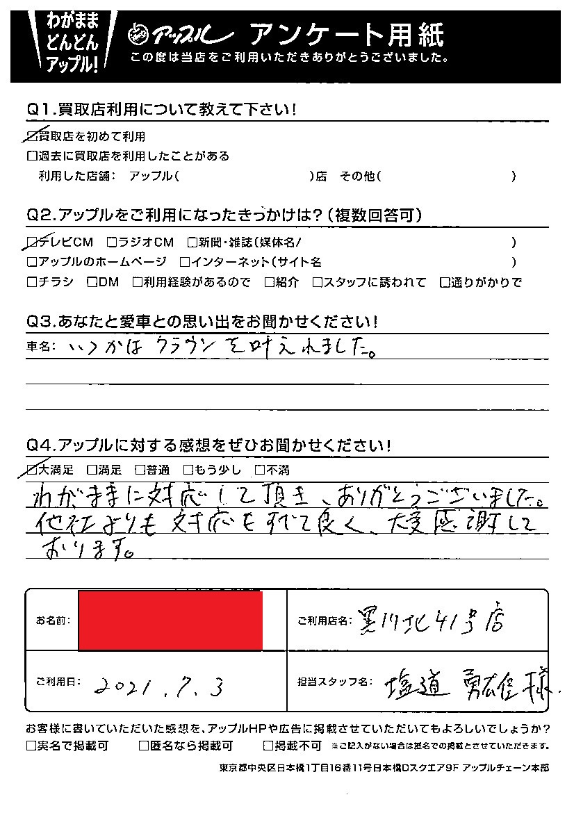 お車のご相談・ 査定だけでもOK! カンタン 入力 30秒 アップルがブランド買取始めました! お電話でも受付中! 受付時間10:00~19:00 ※毎週水曜定休日 052-508-9641 お車のご相談・ 査定だけでもOK! カンタン 入力 30秒 アップルがブランド買取始めました! お電話でも受付中! 受付時間10:00~19:00 ※毎週水曜定休日 052-508-9641 アップルがブランド買取始めました! お電話でも受付中! 受付時間10:00~19:00 ※毎週水曜定休日 052-508-9641 店舗情報 在庫車 スタッフ紹介 ブログ お客様の声 キャンペーン お得 無料査定 click お客様の声 ご記入日: 2021/07/03 匿名希望クラウン様 車名:トヨタ クラウンロイヤル(H11年9月~H30年6月) わがままに対応して頂きありがとうございました。他社よりも対応もすべて良く大変感謝しております。 前へ 次へ お客様の声一覧を見る