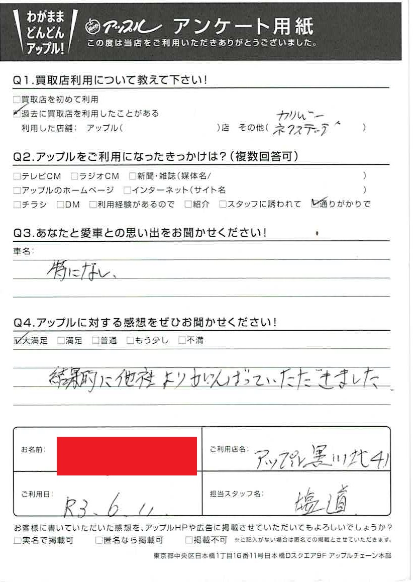 お車のご相談・ 査定だけでもOK! カンタン 入力 30秒 アップルがブランド買取始めました! お電話でも受付中! 受付時間10:00~19:00 ※毎週水曜定休日 052-508-9641 お車のご相談・ 査定だけでもOK! カンタン 入力 30秒 アップルがブランド買取始めました! お電話でも受付中! 受付時間10:00~19:00 ※毎週水曜定休日 052-508-9641 アップルがブランド買取始めました! お電話でも受付中! 受付時間10:00~19:00 ※毎週水曜定休日 052-508-9641 店舗情報 在庫車 スタッフ紹介 ブログ お客様の声 キャンペーン お得 無料査定 click お客様の声 ご記入日: 2021/06/11 匿名希望ムーヴ様 車名:ダイハツ ムーヴ 結果的に他社よりがんばっていただきました。 前へ 次へ お客様の声一覧を見る