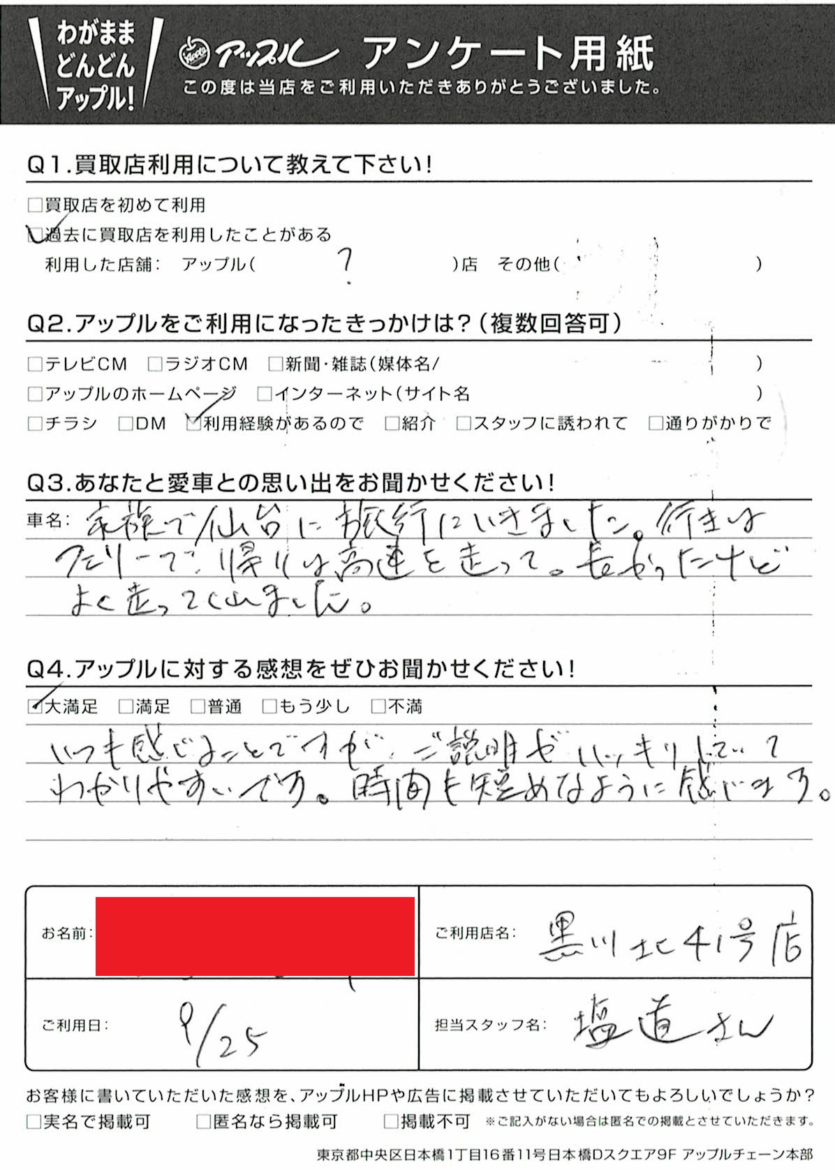 お車のご相談・ 査定だけでもOK! カンタン 入力 30秒 アップルがブランド買取始めました! お電話でも受付中! 受付時間10:00~19:00 ※毎週水曜定休日 052-508-9641 お車のご相談・ 査定だけでもOK! カンタン 入力 30秒 アップルがブランド買取始めました! お電話でも受付中! 受付時間10:00~19:00 ※毎週水曜定休日 052-508-9641 アップルがブランド買取始めました! お電話でも受付中! 受付時間10:00~19:00 ※毎週水曜定休日 052-508-9641 店舗情報 在庫車 スタッフ紹介 ブログ お客様の声 キャンペーン お得 無料査定 click お客様の声 ご記入日: 2021/09/25 匿名希望アテンザスポーツ様 車名:マツダ アテンザスポーツワゴン いつも感じることですが、ご説明がハッキリしていて分かりやすいです。時間も短めなように感じます。 前へ 次へ お客様の声一覧を見る