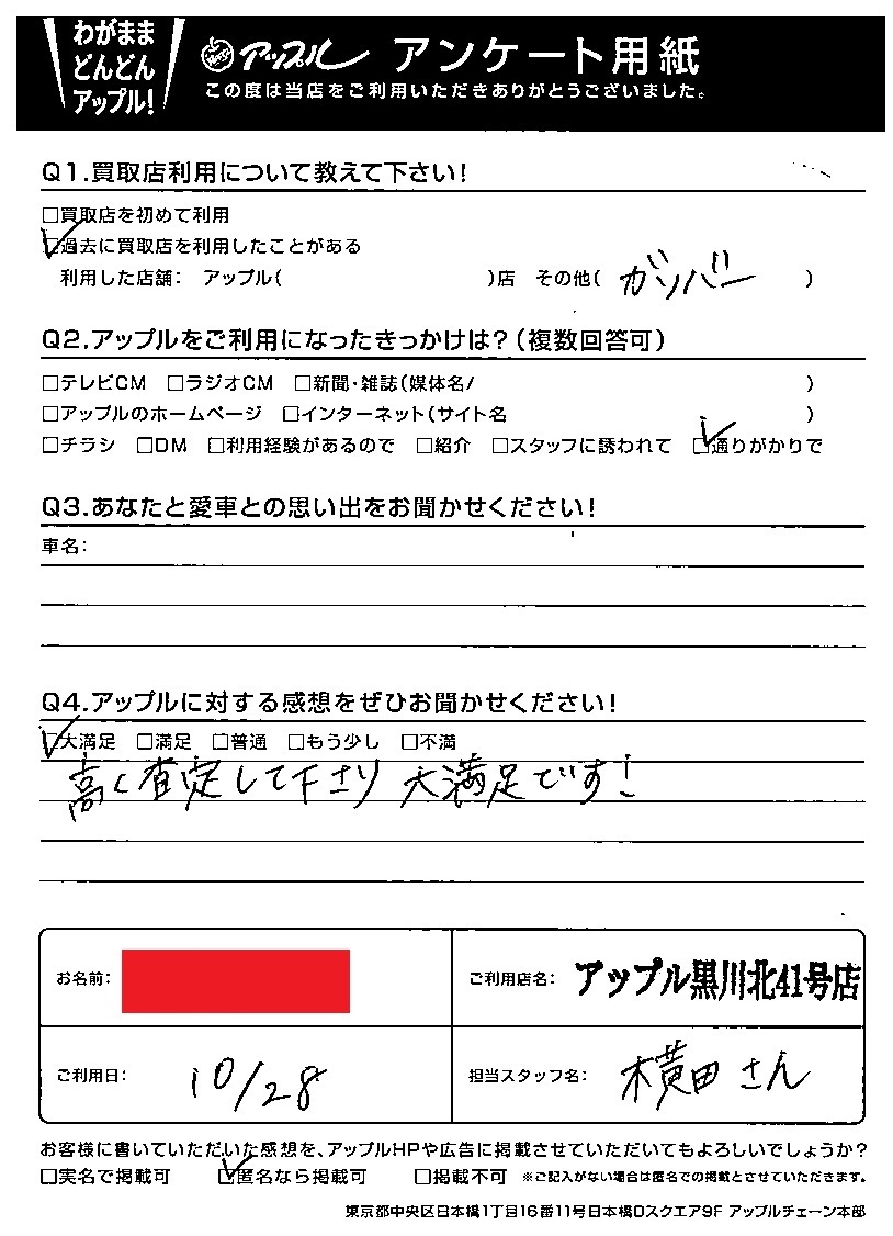 お車のご相談・ 査定だけでもOK! カンタン 入力 30秒 アップルがブランド買取始めました! お電話でも受付中! 受付時間10:00~19:00 ※毎週水曜定休日 052-508-9641 お車のご相談・ 査定だけでもOK! カンタン 入力 30秒 アップルがブランド買取始めました! お電話でも受付中! 受付時間10:00~19:00 ※毎週水曜定休日 052-508-9641 アップルがブランド買取始めました! お電話でも受付中! 受付時間10:00~19:00 ※毎週水曜定休日 052-508-9641 店舗情報 在庫車 スタッフ紹介 ブログ お客様の声 キャンペーン お得 無料査定 click お客様の声 ご記入日: 2021/10/28 匿名希望アップ!様 車名:フォルクスワーゲン up! 高く査定して下さり大満足です! 前へ 次へ お客様の声一覧を見る