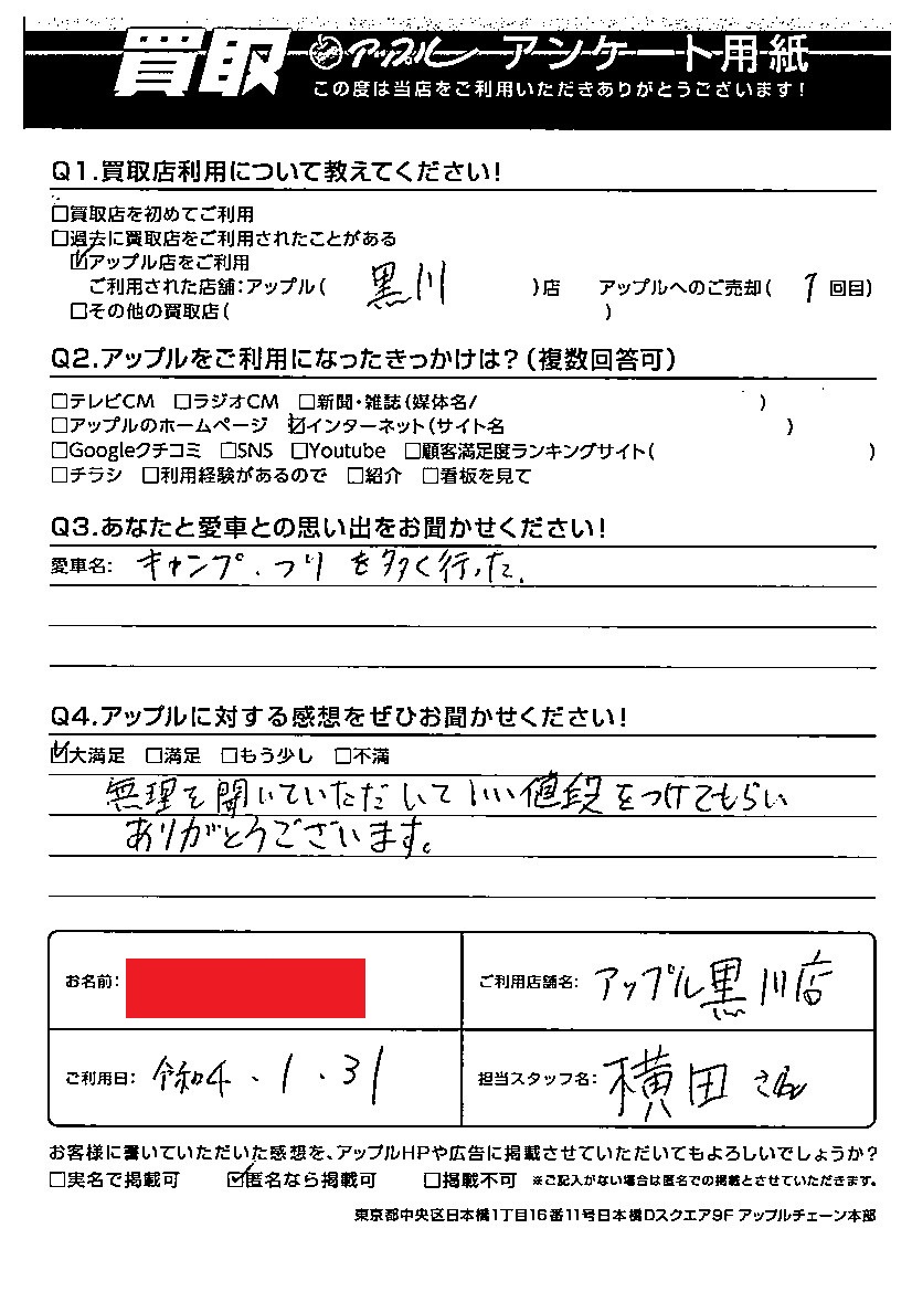お車のご相談・ 査定だけでもOK! カンタン 入力 30秒 アップルがブランド買取始めました! お電話でも受付中! 受付時間10:00~19:00 ※毎週水曜定休日 052-508-9641 お車のご相談・ 査定だけでもOK! カンタン 入力 30秒 アップルがブランド買取始めました! お電話でも受付中! 受付時間10:00~19:00 ※毎週水曜定休日 052-508-9641 アップルがブランド買取始めました! お電話でも受付中! 受付時間10:00~19:00 ※毎週水曜定休日 052-508-9641 店舗情報 在庫車 スタッフ紹介 ブログ お客様の声 キャンペーン お得 無料査定 click お客様の声 ご記入日: 2022/01/31 匿名希望キューブ様 車名:日産 キューブ 無理を聞いていただいていい値段をつけてもらいありがとうございます。 前へ 次へ お客様の声一覧を見る