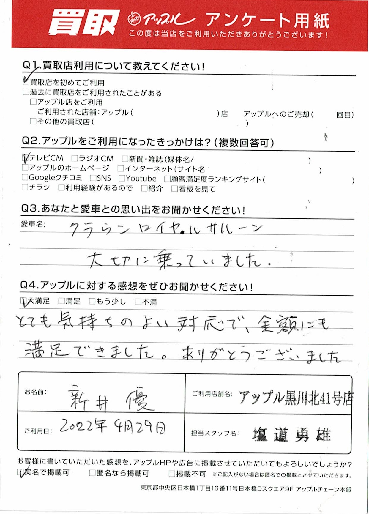 お車のご相談・ 査定だけでもOK! カンタン 入力 30秒 アップルがブランド買取始めました! お電話でも受付中! 受付時間10:00~19:00 ※毎週水曜定休日 052-508-9641 お車のご相談・ 査定だけでもOK! カンタン 入力 30秒 アップルがブランド買取始めました! お電話でも受付中! 受付時間10:00~19:00 ※毎週水曜定休日 052-508-9641 アップルがブランド買取始めました! お電話でも受付中! 受付時間10:00~19:00 ※毎週水曜定休日 052-508-9641 店舗情報 在庫車 スタッフ紹介 ブログ お客様の声 キャンペーン お得 無料査定 click お客様の声 ご記入日: 2022/04/29 新井 優様 車名:トヨタ クラウンロイヤル(H11年9月~H30年6月) とても気持ちのよい対応で、金額にも満足できました。ありがとうございました。 前へ 次へ お客様の声一覧を見る