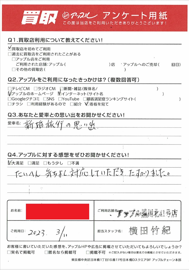 お車のご相談・ 査定だけでもOK! カンタン 入力 30秒 アップルがブランド買取始めました! お電話でも受付中! 受付時間10:00~19:00 ※毎週水曜定休日 052-508-9641 お車のご相談・ 査定だけでもOK! カンタン 入力 30秒 アップルがブランド買取始めました! お電話でも受付中! 受付時間10:00~19:00 ※毎週水曜定休日 052-508-9641 アップルがブランド買取始めました! お電話でも受付中! 受付時間10:00~19:00 ※毎週水曜定休日 052-508-9641 店舗情報 在庫車 スタッフ紹介 ブログ お客様の声 キャンペーン お得 無料査定 click お客様の声 ご記入日: 2023/03/11 匿名希望アルテッツァ様 車名:トヨタ アルテッツァ たいへん気持ちよく対応していただきたすかりました。 前へ 次へ お客様の声一覧を見る