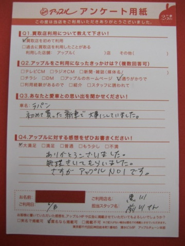 お車のご相談・ 査定だけでもOK! カンタン 入力 30秒 アップルがブランド買取始めました! お電話でも受付中! 受付時間10:00~19:00 ※毎週水曜定休日 052-508-9641 お車のご相談・ 査定だけでもOK! カンタン 入力 30秒 アップルがブランド買取始めました! お電話でも受付中! 受付時間10:00~19:00 ※毎週水曜定休日 052-508-9641 アップルがブランド買取始めました! お電話でも受付中! 受付時間10:00~19:00 ※毎週水曜定休日 052-508-9641 店舗情報 在庫車 スタッフ紹介 ブログ お客様の声 キャンペーン お得 無料査定 click お客様の声 ご記入日: 2014/06/08 H様 ありがとうございました。無理聞いてもらいました。さすがアップルNO1です。 前へ 次へ お客様の声一覧を見る