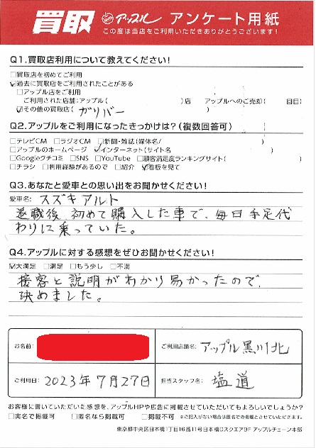 お車のご相談・ 査定だけでもOK! カンタン 入力 30秒 アップルがブランド買取始めました! お電話でも受付中! 受付時間10:00~19:00 ※毎週水曜定休日 052-508-9641 お車のご相談・ 査定だけでもOK! カンタン 入力 30秒 アップルがブランド買取始めました! お電話でも受付中! 受付時間10:00~19:00 ※毎週水曜定休日 052-508-9641 アップルがブランド買取始めました! お電話でも受付中! 受付時間10:00~19:00 ※毎週水曜定休日 052-508-9641 店舗情報 在庫車 スタッフ紹介 ブログ お客様の声 キャンペーン お得 無料査定 click お客様の声 ご記入日: 2023/07/27 匿名希望アルト様 車名:スズキ アルト (2015年12月以降のワークス含む) 退職後、初めて購入した車で、毎日手足代わりに乗っていた。接客と説明がわかり易かったので決めました。 前へ 次へ お客様の声一覧を見る