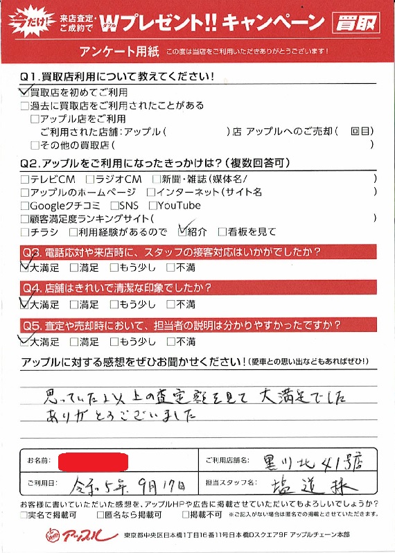 お車のご相談・ 査定だけでもOK! カンタン 入力 30秒 アップルがブランド買取始めました! お電話でも受付中! 受付時間10:00~19:00 ※毎週水曜定休日 052-508-9641 お車のご相談・ 査定だけでもOK! カンタン 入力 30秒 アップルがブランド買取始めました! お電話でも受付中! 受付時間10:00~19:00 ※毎週水曜定休日 052-508-9641 アップルがブランド買取始めました! お電話でも受付中! 受付時間10:00~19:00 ※毎週水曜定休日 052-508-9641 店舗情報 在庫車 スタッフ紹介 ブログ お客様の声 キャンペーン お得 無料査定 click お客様の声 ご記入日: 2023/09/17 匿名希望ラクティス様 車名:トヨタ ラクティス 思っていた以上の査定額を見て大満足でした。ありがとうございました。 前へ 次へ お客様の声一覧を見る