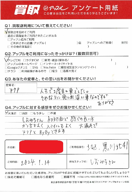 お車のご相談・ 査定だけでもOK! カンタン 入力 30秒 アップルがブランド買取始めました! お電話でも受付中! 受付時間10:00~19:00 ※毎週水曜定休日 052-508-9641 お車のご相談・ 査定だけでもOK! カンタン 入力 30秒 アップルがブランド買取始めました! お電話でも受付中! 受付時間10:00~19:00 ※毎週水曜定休日 052-508-9641 アップルがブランド買取始めました! お電話でも受付中! 受付時間10:00~19:00 ※毎週水曜定休日 052-508-9641 店舗情報 在庫車 スタッフ紹介 ブログ お客様の声 キャンペーン お得 無料査定 click お客様の声 ご記入日: 2024/01/14 匿名希望アクア様 車名:トヨタ アクア 人生で2度目の車でした。それなりに思い出深い車なのですがありがとう。しおみちさん初対面で感じの良い方かつ舌もよくスマイルもよく大満足でアクアとByeByeできます。 前へ 次へ お客様の声一覧を見る