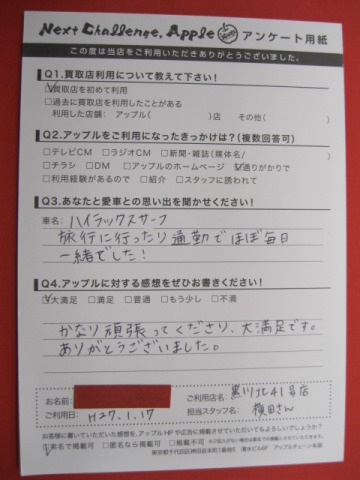 お車のご相談・ 査定だけでもOK! カンタン 入力 30秒 アップルがブランド買取始めました! お電話でも受付中! 受付時間10:00~19:00 ※毎週水曜定休日 052-508-9641 お車のご相談・ 査定だけでもOK! カンタン 入力 30秒 アップルがブランド買取始めました! お電話でも受付中! 受付時間10:00~19:00 ※毎週水曜定休日 052-508-9641 アップルがブランド買取始めました! お電話でも受付中! 受付時間10:00~19:00 ※毎週水曜定休日 052-508-9641 店舗情報 在庫車 スタッフ紹介 ブログ お客様の声 キャンペーン お得 無料査定 click お客様の声 ご記入日: 2015/01/17 K.R様 かなり頑張ってくださり、大満足です。ありがとうございました。 前へ 次へ お客様の声一覧を見る