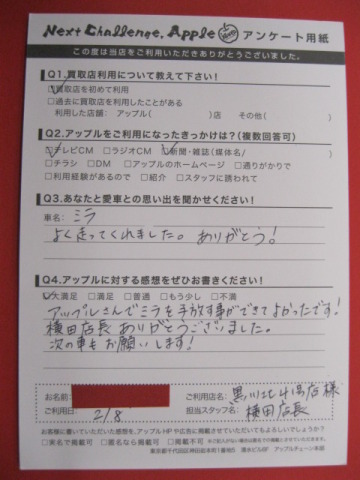お車のご相談・ 査定だけでもOK! カンタン 入力 30秒 アップルがブランド買取始めました! お電話でも受付中! 受付時間10:00~19:00 ※毎週水曜定休日 052-508-9641 お車のご相談・ 査定だけでもOK! カンタン 入力 30秒 アップルがブランド買取始めました! お電話でも受付中! 受付時間10:00~19:00 ※毎週水曜定休日 052-508-9641 アップルがブランド買取始めました! お電話でも受付中! 受付時間10:00~19:00 ※毎週水曜定休日 052-508-9641 店舗情報 在庫車 スタッフ紹介 ブログ お客様の声 キャンペーン お得 無料査定 click お客様の声 ご記入日: 2015/02/08 A.S様 アップルさんでミラを手放す事ができてよかったです!横田店長ありがとうございました。次の車もお願いします! 前へ 次へ お客様の声一覧を見る