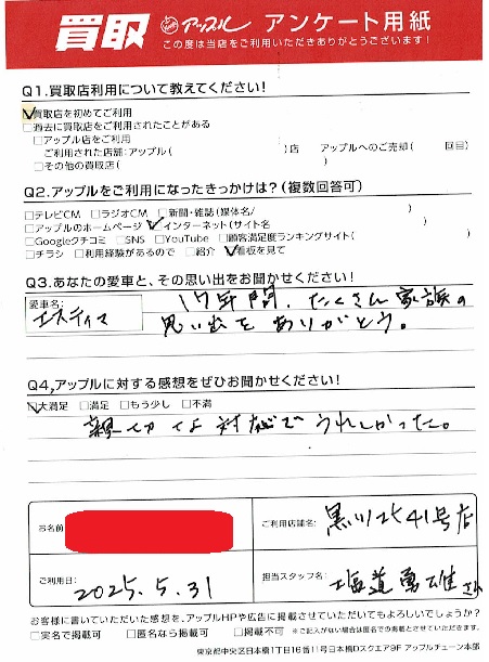 お車のご相談・ 査定だけでもOK! カンタン 入力 30秒 アップルがブランド買取始めました! お電話でも受付中! 受付時間10:00~19:00 ※毎週水曜定休日 052-508-9641 お車のご相談・ 査定だけでもOK! カンタン 入力 30秒 アップルがブランド買取始めました! お電話でも受付中! 受付時間10:00~19:00 ※毎週水曜定休日 052-508-9641 アップルがブランド買取始めました! お電話でも受付中! 受付時間10:00~19:00 ※毎週水曜定休日 052-508-9641 店舗情報 在庫車 スタッフ紹介 ブログ お客様の声 キャンペーン お得 無料査定 click お客様の声 ご記入日: 2025/05/31 匿名希望エスティマ様 車名:トヨタ エスティマ ご売却の愛車とその思い出:エスティマ17年間沢山の家族の思い出をありがとう。アップルに対する感想親切丁寧な対応でうれしかった。 前へ 次へ お客様の声一覧を見る