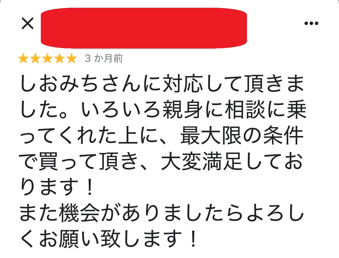 いろいろ親身に相談に乗ってくれた上に、最大限の条件で買って頂き大変満足しております。