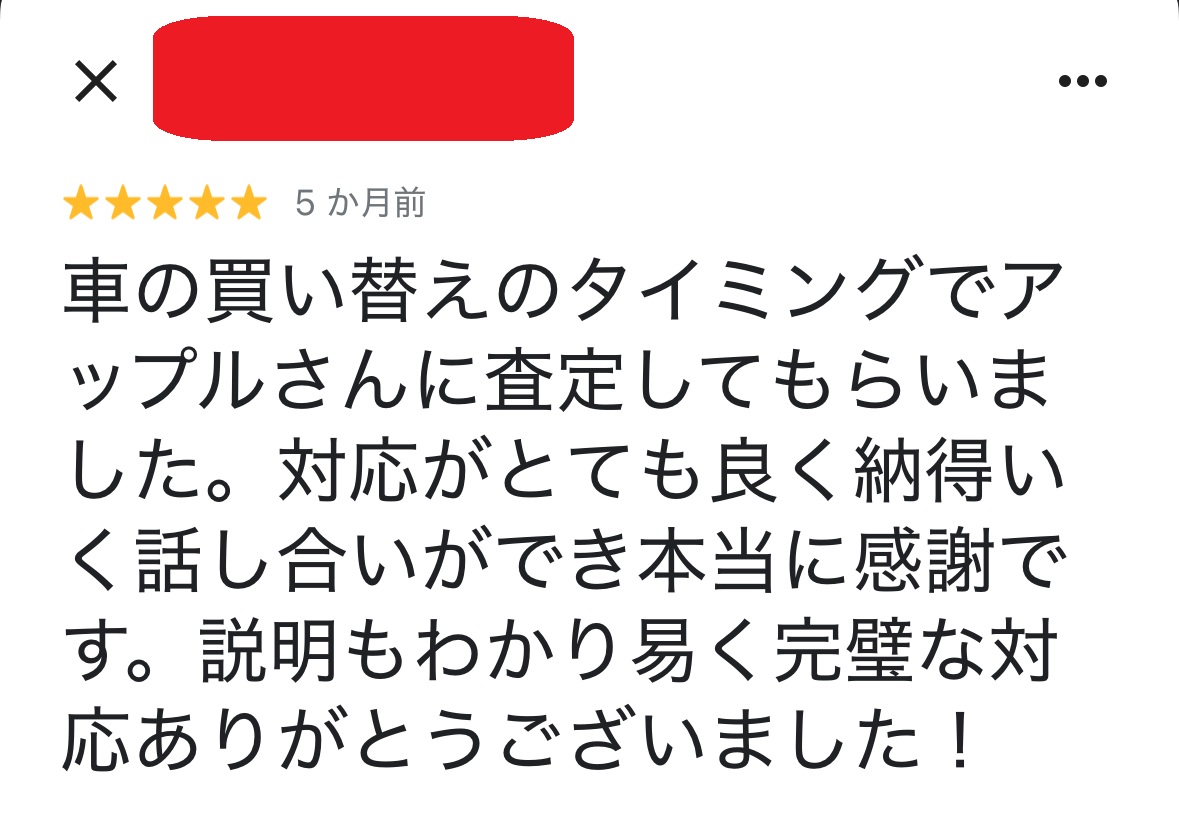 お車のご相談・ 査定だけでもOK! カンタン 入力 30秒 アップルがブランド買取始めました! お電話でも受付中! 受付時間10:00~19:00 ※毎週水曜定休日 052-508-9641 お車のご相談・ 査定だけでもOK! カンタン 入力 30秒 アップルがブランド買取始めました! お電話でも受付中! 受付時間10:00~19:00 ※毎週水曜定休日 052-508-9641 アップルがブランド買取始めました! お電話でも受付中! 受付時間10:00~19:00 ※毎週水曜定休日 052-508-9641 店舗情報 在庫車 スタッフ紹介 ブログ お客様の声 キャンペーン お得 無料査定 click お客様の声 ご記入日: 2025/05/29 匿名希望C-HR様 車名:トヨタ C-HR 車の買い替えのタイミングでアップルさんに査定してもらいました。対応がとてもよく納得いく話し合いができ本当に感謝です。説明もわかり易く完璧な対応ありがとうございました! 前へ 次へ お客様の声一覧を見る